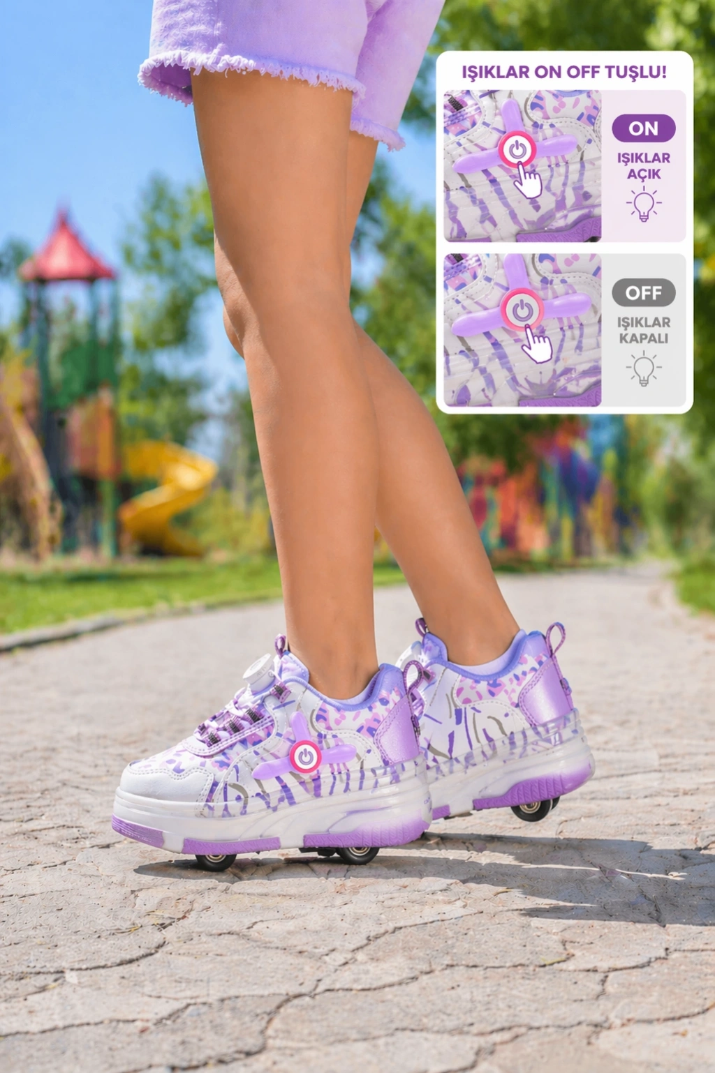 Şıklığı, eğlenceyi ve hareketi bir araya getiren ışıklı kaykay mekanizmalı paten ayakkabı, çocukların günlük kullanımına enerjik bir dokunuş katar.