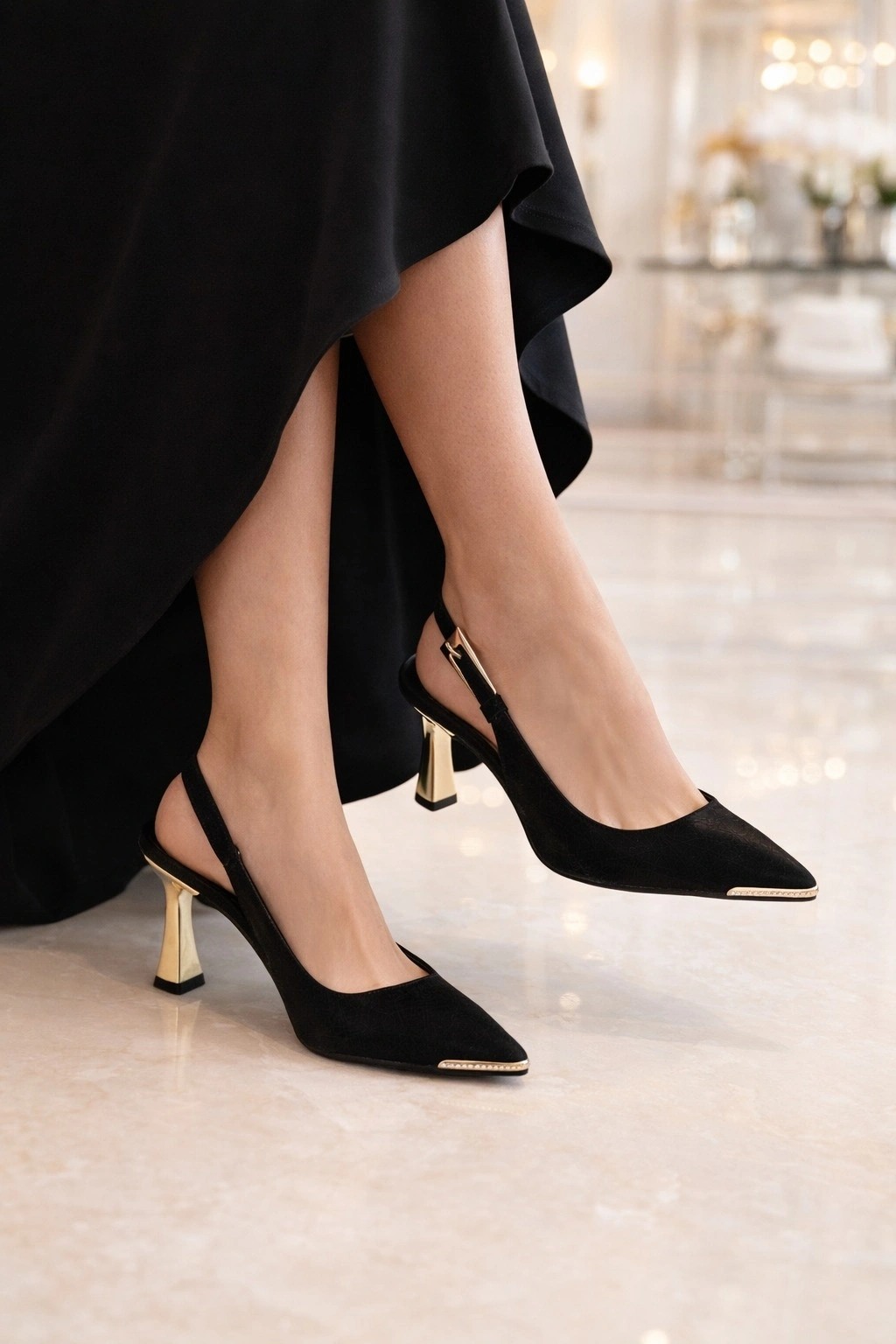 Zarif duruşu ve modern detaylarıyla öne çıkan bu kadın slingback stiletto, saten görünümlü yüzeyi ve gold sivri burun detayı ile kombinlerinize şıklık katar.