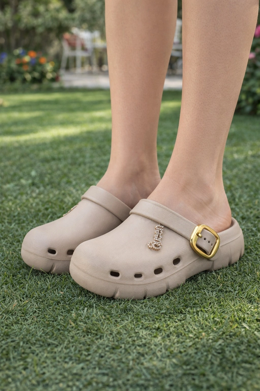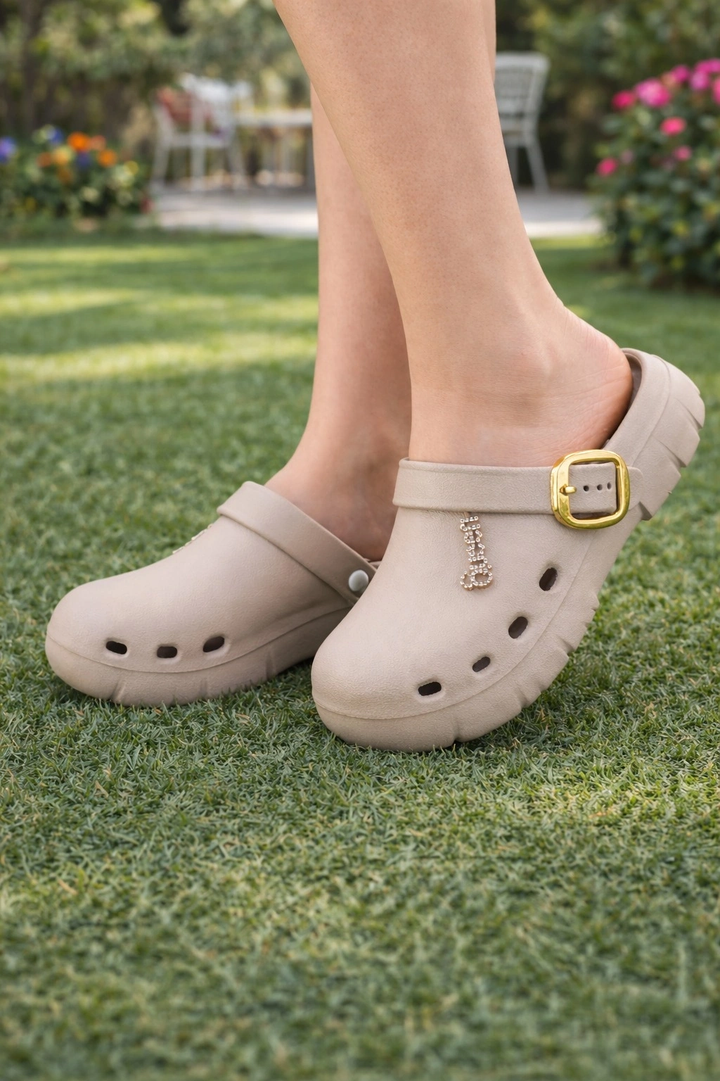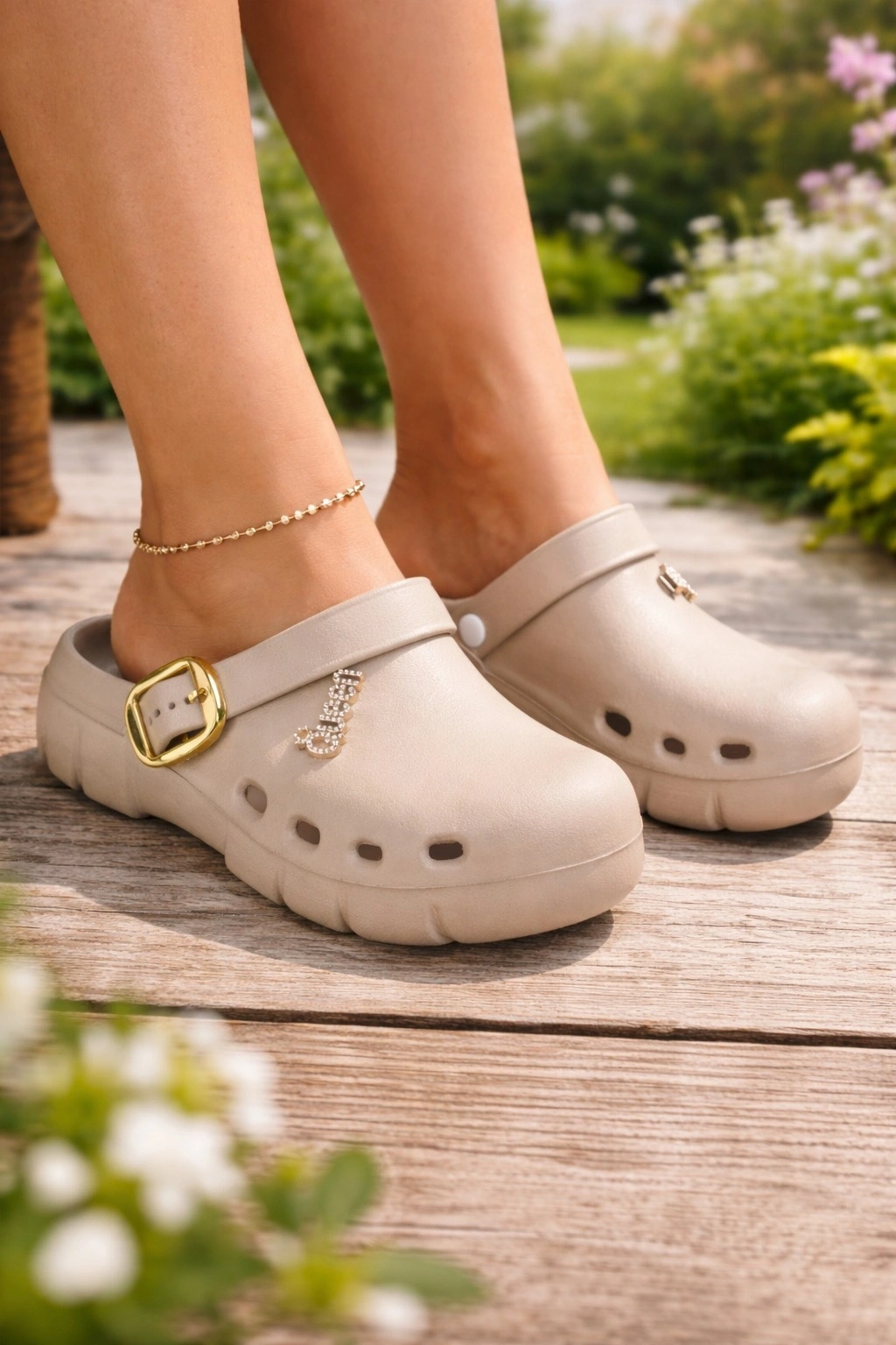 Tokalı bant tasarımı ve taşlı “Queen” detayıyla şık, günlük kullanıma uygun sabo terlik.
