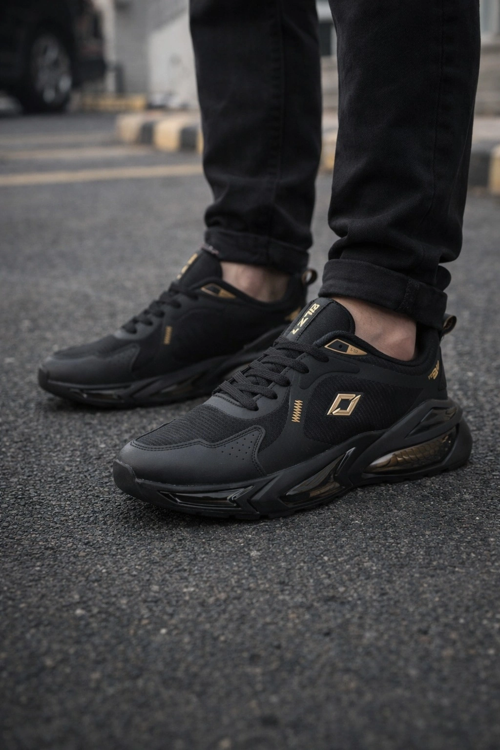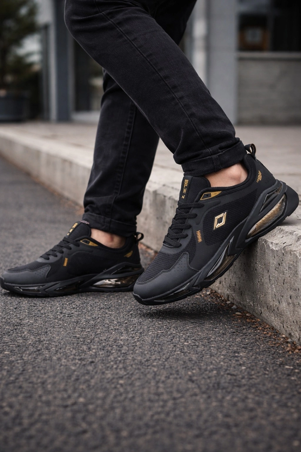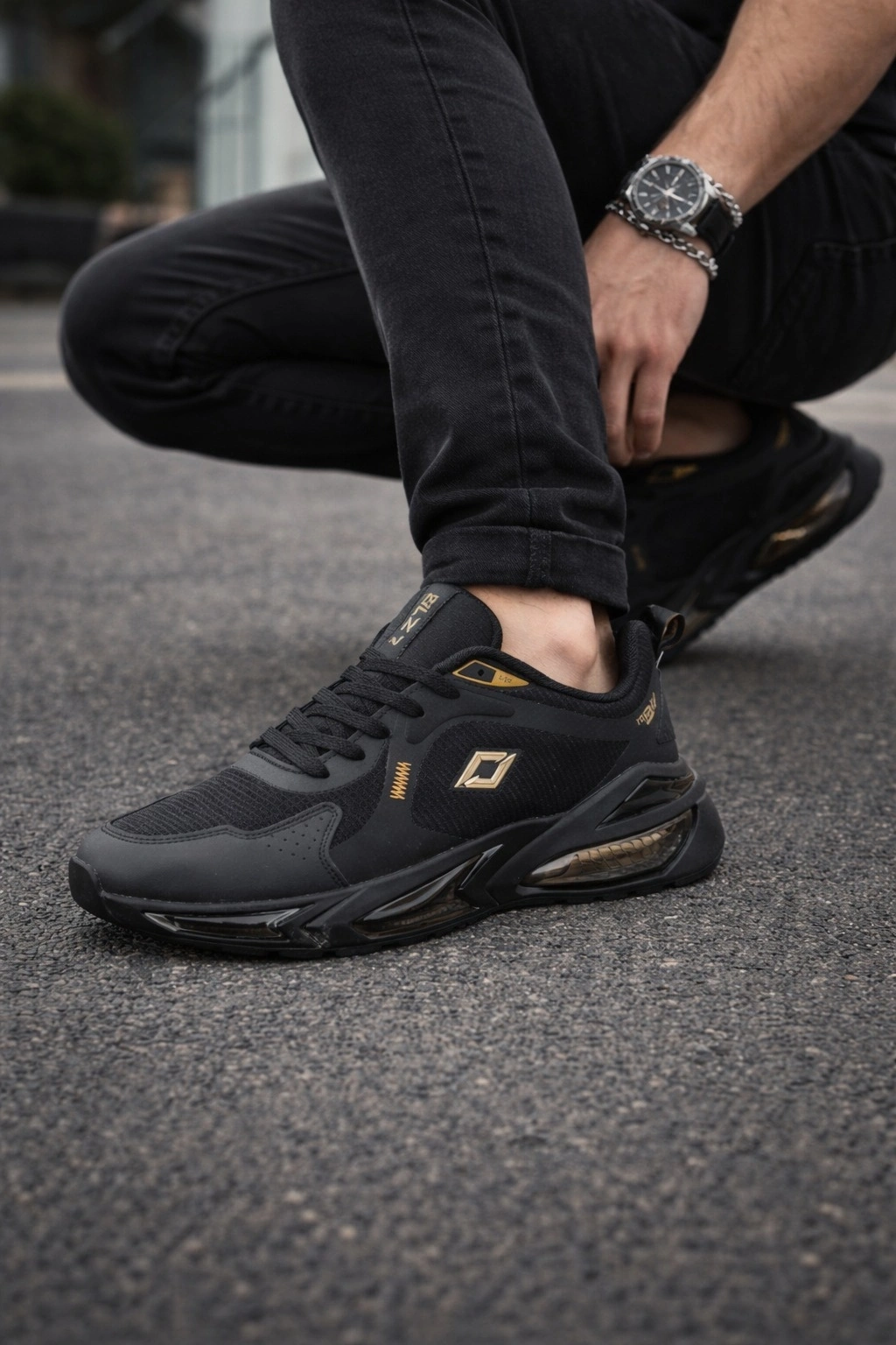 (Air Taban) Günlük kullanımda konfor ve şıklığı bir araya getiren bu erkek air tabanlı spor ayakkabı, modern tasarımı ve altın (gold) detayları ile dikkat çeker.