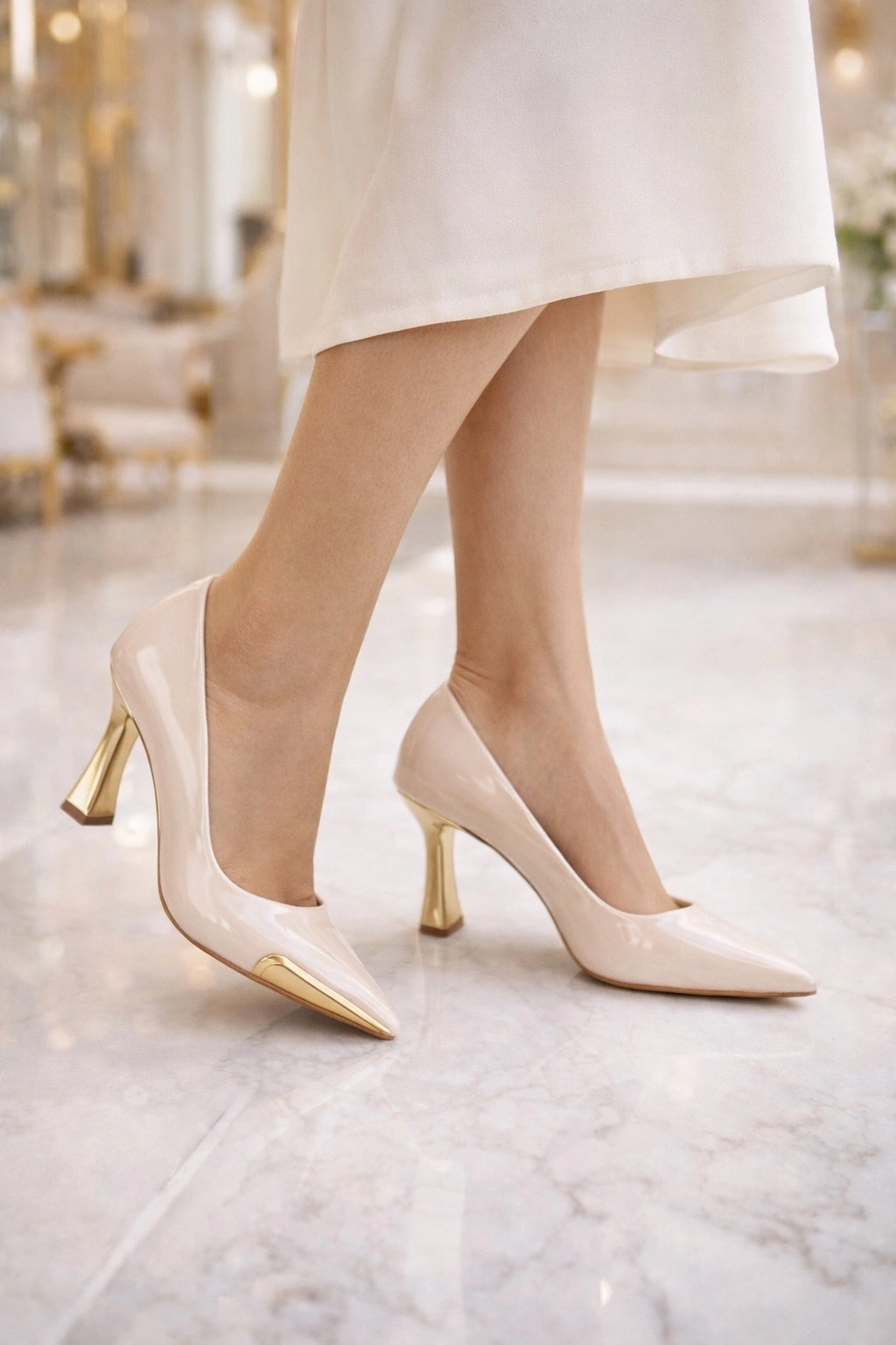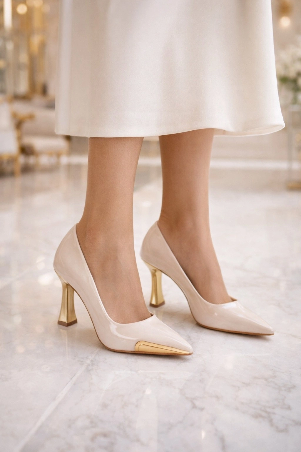 Gold Topuk Detaylı Şıklık9 cm topuk, bacak boyunu daha uzun gösteren ve duruşa feminen, iddialı bir hava katan ideal bir yüksekliktir.