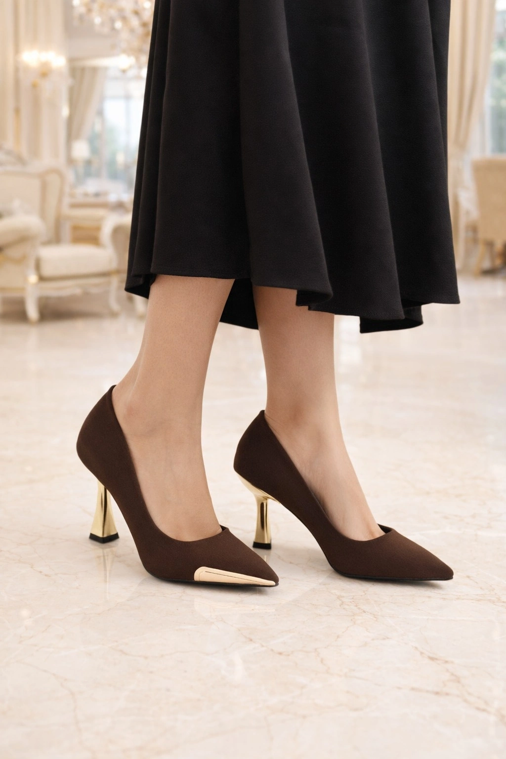 Gold Topuk Detaylı Şıklık9 cm topuk, bacak boyunu daha uzun gösteren ve duruşa feminen, iddialı bir hava katan ideal bir yüksekliktir.