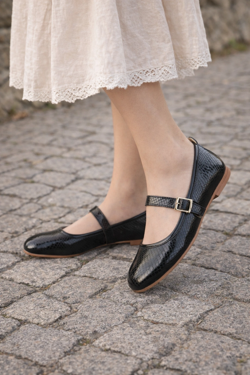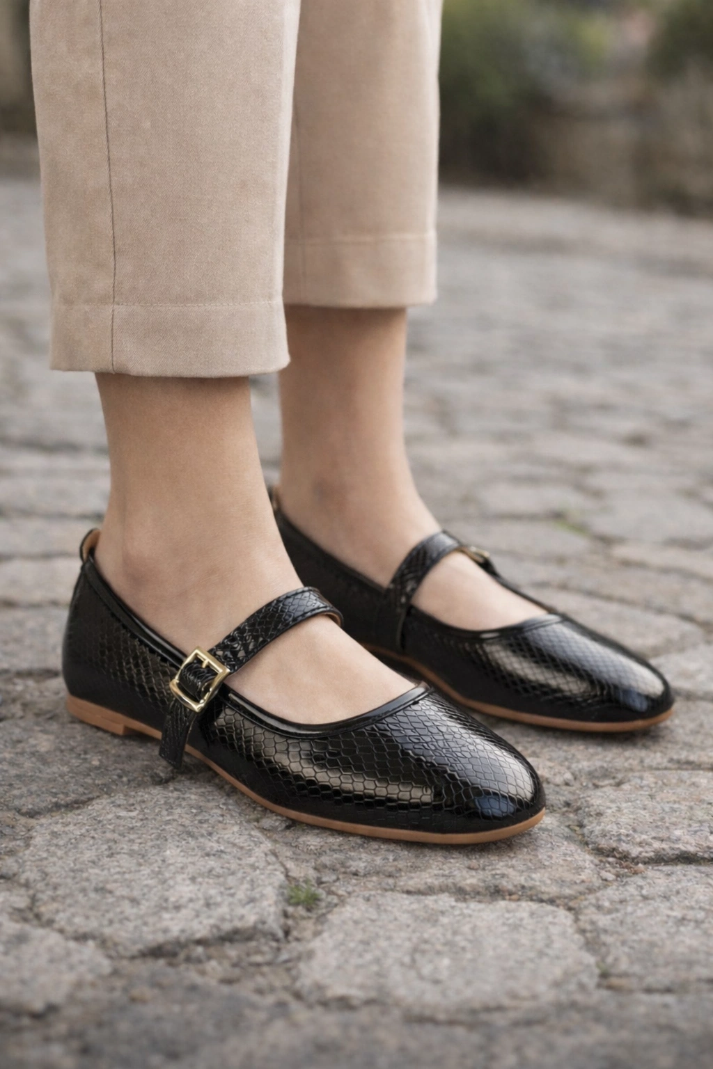 Metalik ışıltısı ve yılan dokulu yüzeyi ile öne çıkan bu tokalı bant detaylı kadın babet ( günlük kombinlere hem de özel gün şıklığına zarif bir dokunuş katar.