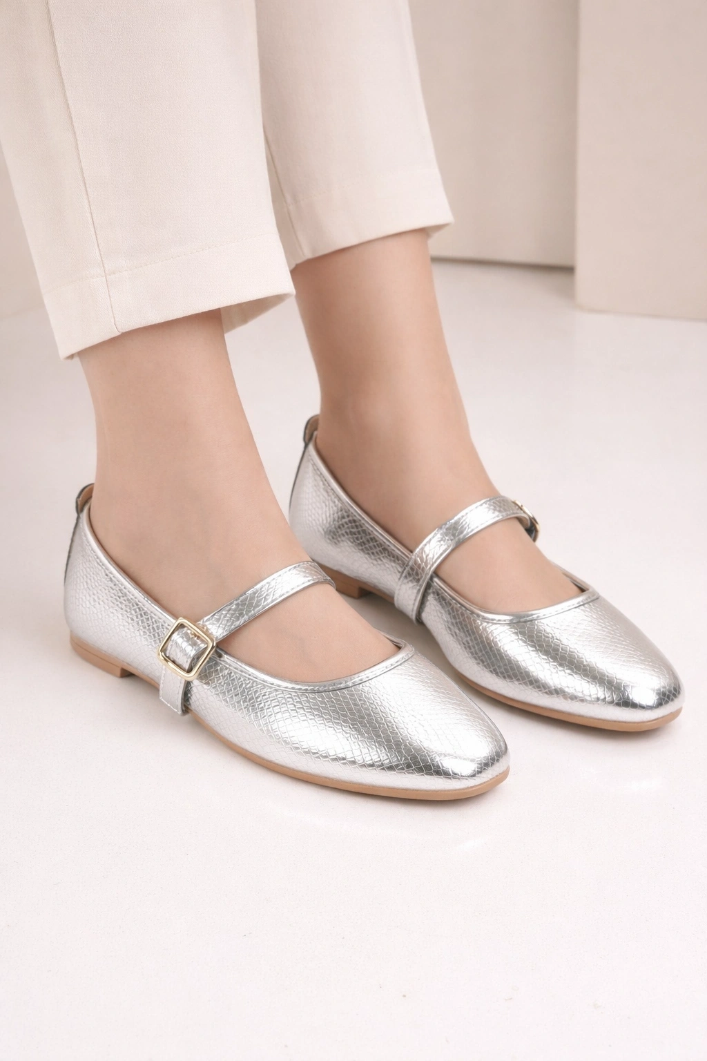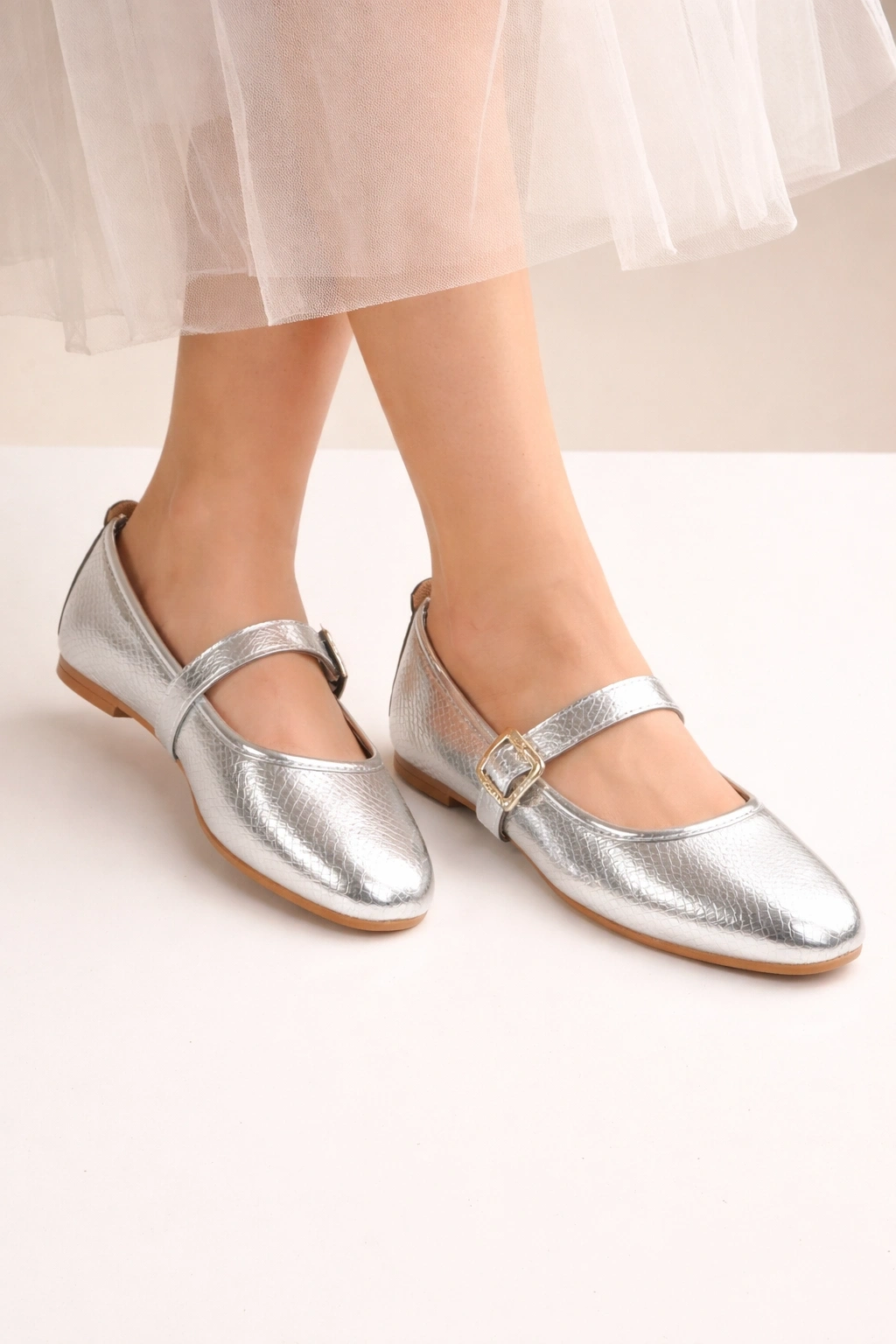Metalik ışıltısı ve yılan dokulu yüzeyi ile öne çıkan bu tokalı bant detaylı kadın babet ( günlük kombinlere hem de özel gün şıklığına zarif bir dokunuş katar.