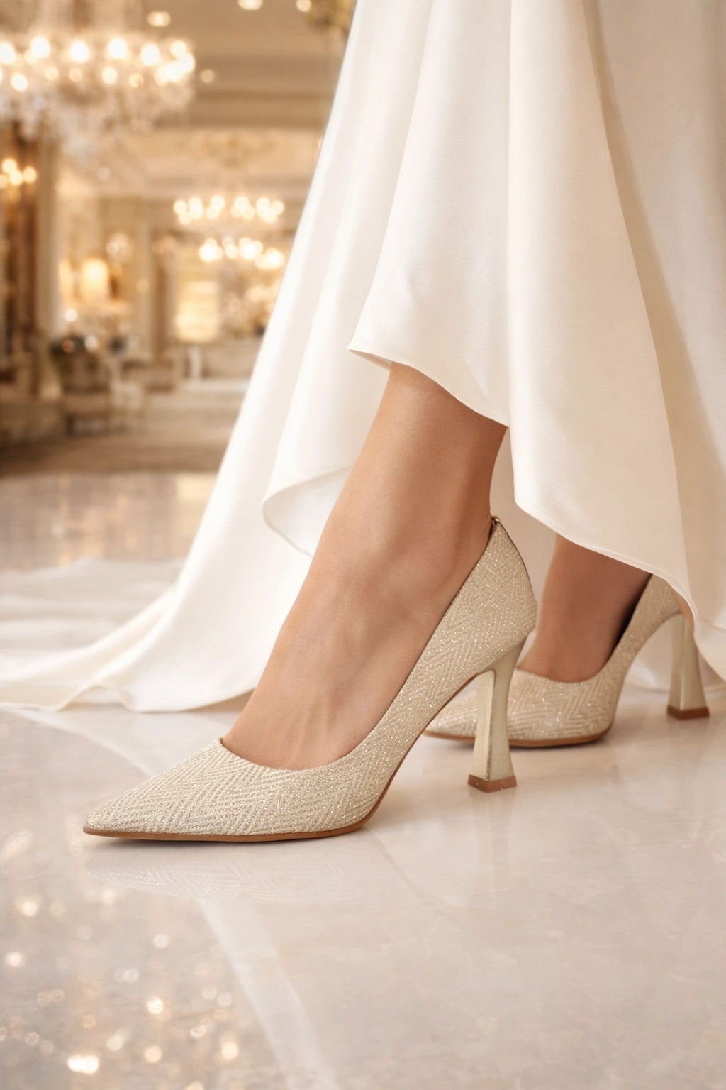 Işıltılı ve şık görünümüyle öne çıkan bu kadın simli sivri burun topuklu ayakkabı, özel gün kombinlerinize zarafet katar.