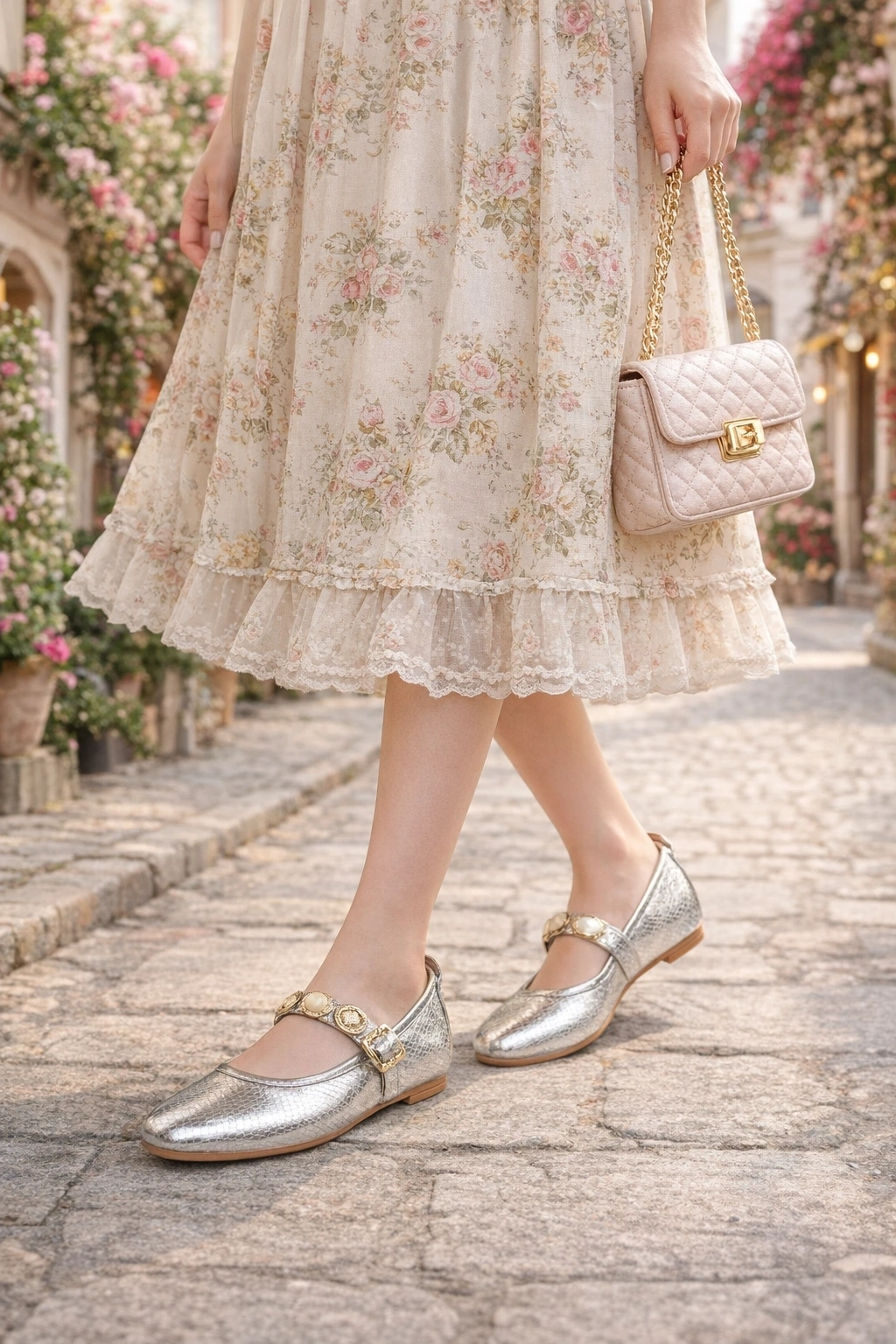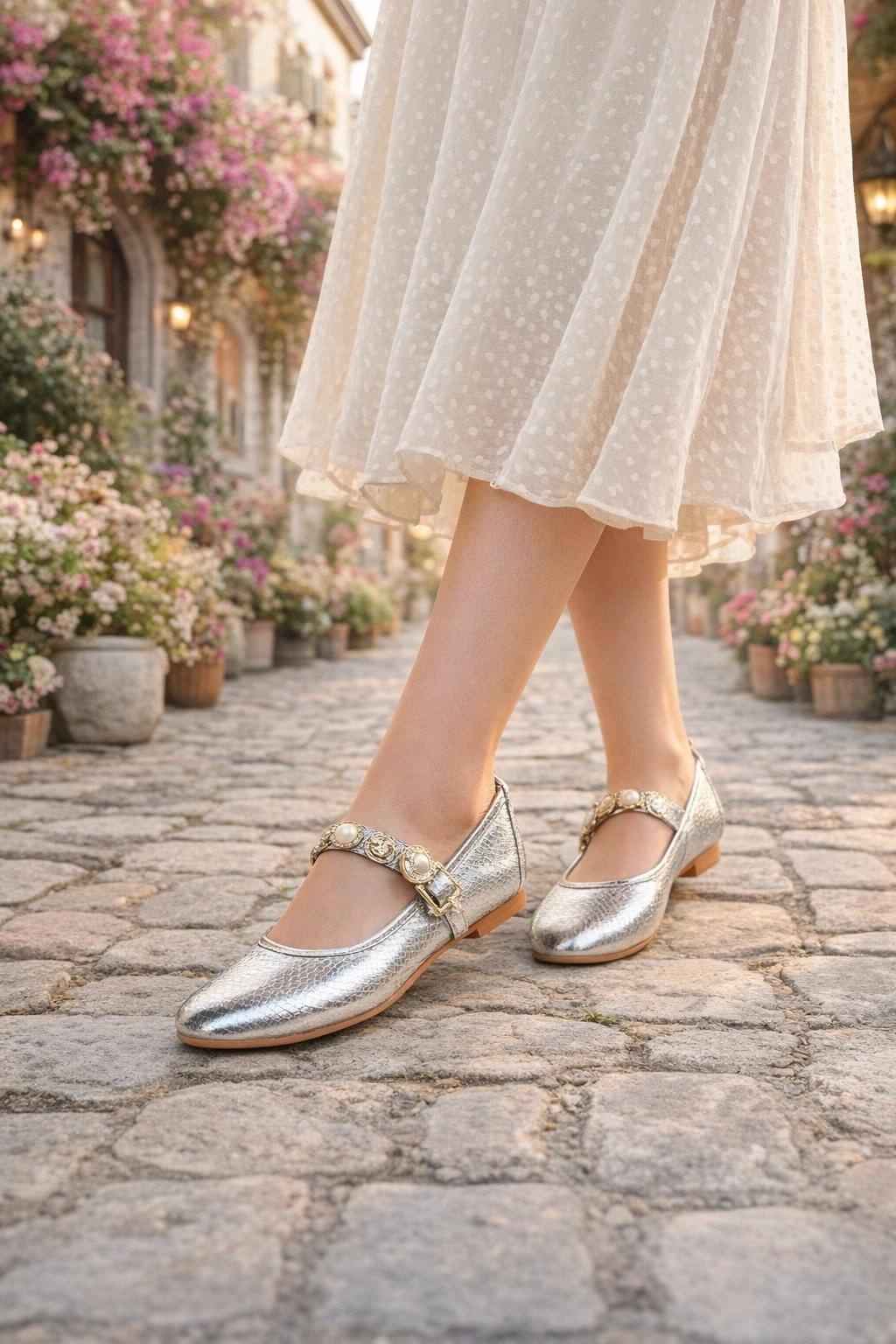 Metalik dokusu ve inci detaylı tokalı bant tasarımı ile öne çıkan bu kadın babet, hem günlük kullanımda hem de özel gün kombinlerinde şıklığı tamamlar.