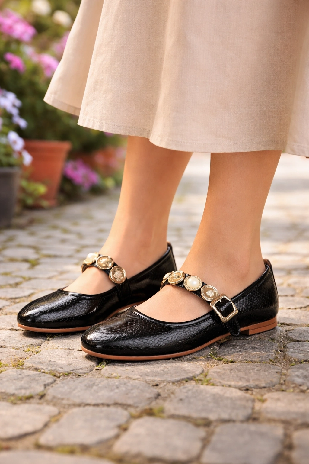 Metalik dokusu ve inci detaylı tokalı bant tasarımı ile öne çıkan bu kadın babet, hem günlük kullanımda hem de özel gün kombinlerinde şıklığı tamamlar.