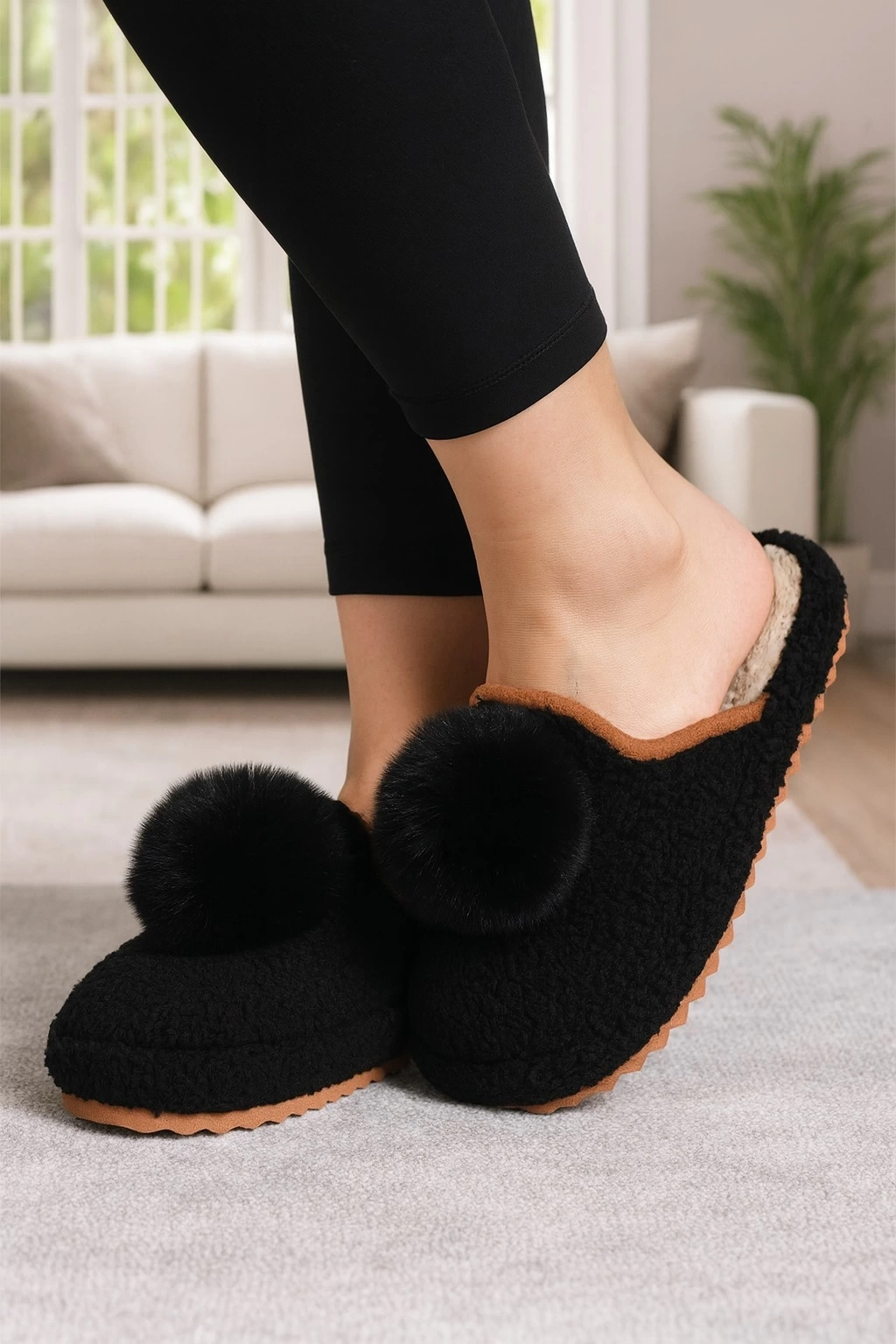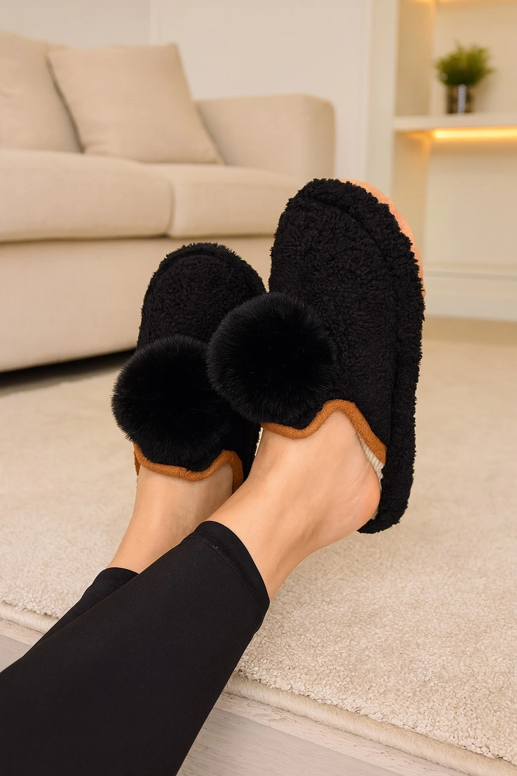 Ponpon detaylı kışlık ev terliğiMalzeme:Yumuşak, peluş görünümlü