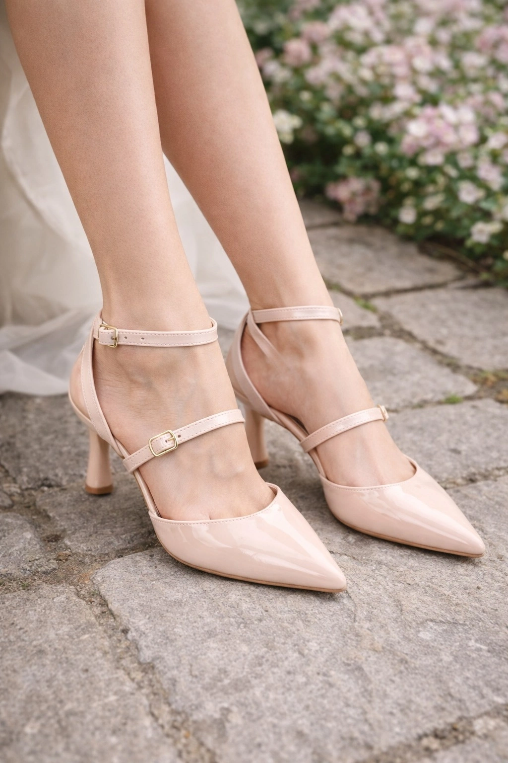 Kadın Rugan Sivri Burun Bilekten Bağlamalı İnce Bant Topuklu Ayakkabı