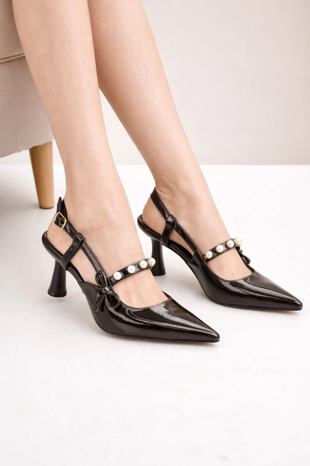 Kadın Sivri Burun İnci Detaylı Slingback İnce Topuk Rugan Ayakkabı