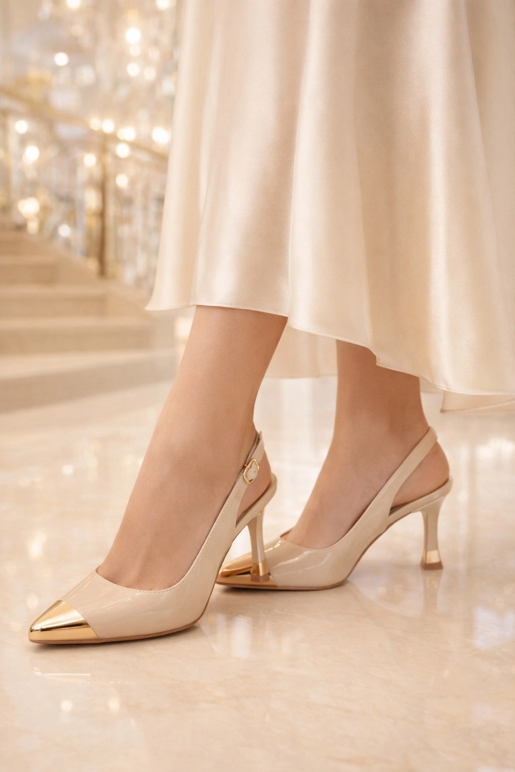 Zarif duruşu ve modern detaylarıyla öne çıkan bu kadın slingback stiletto, saten görünümlü yüzeyi ve gold sivri burun detayı ile kombinlerinize şıklık katar.