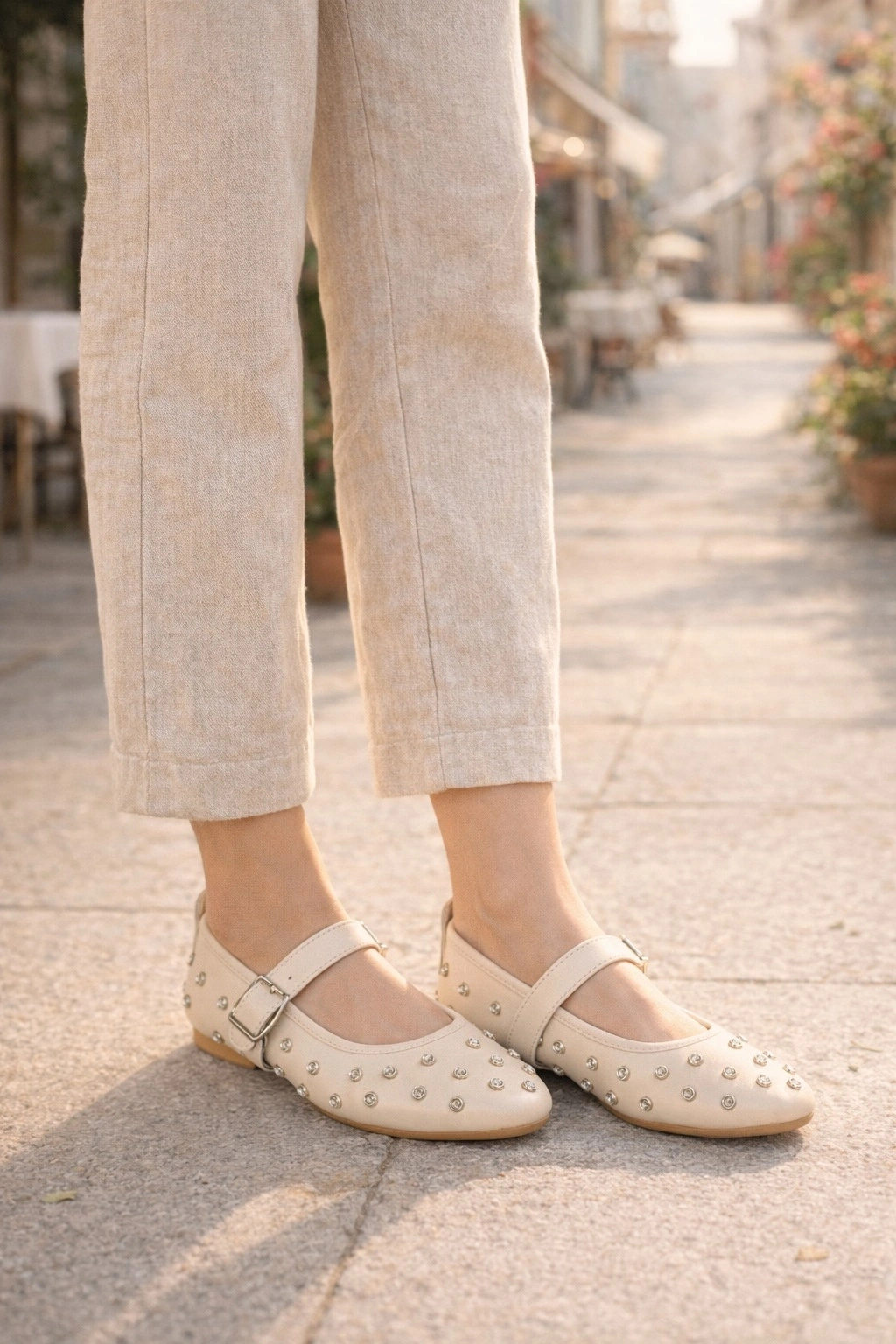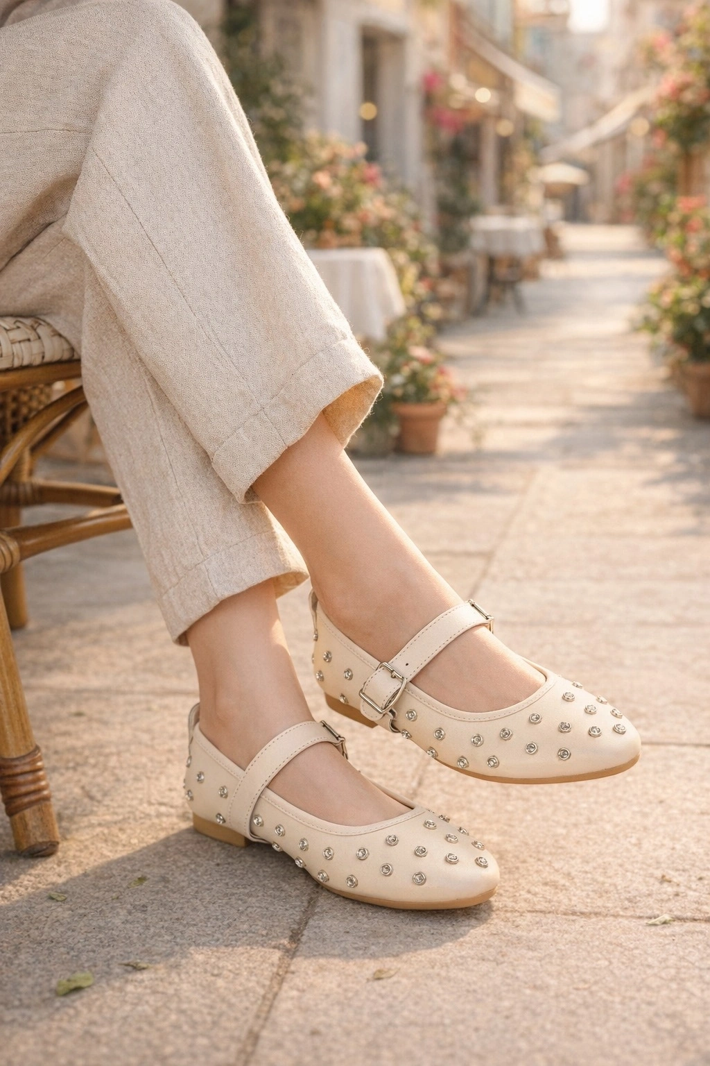 Zarif taş süslemeleriyle dikkat çeken bu babet, tokalı bant yapısı sayesinde ayağı daha iyi kavrar ve gün boyu konfor sağlar.