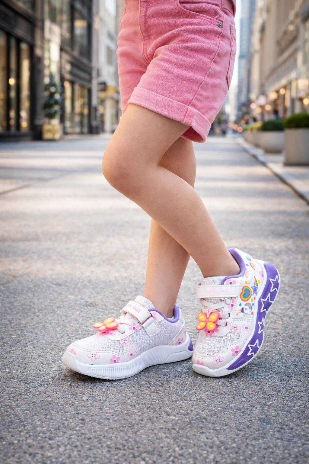 Kız çocuklar için tasarlanan bu eğlenceli ve şık spor ayakkabı, renkli desenleri ve sevimli figür detaylarıyla dikkat çeker.
