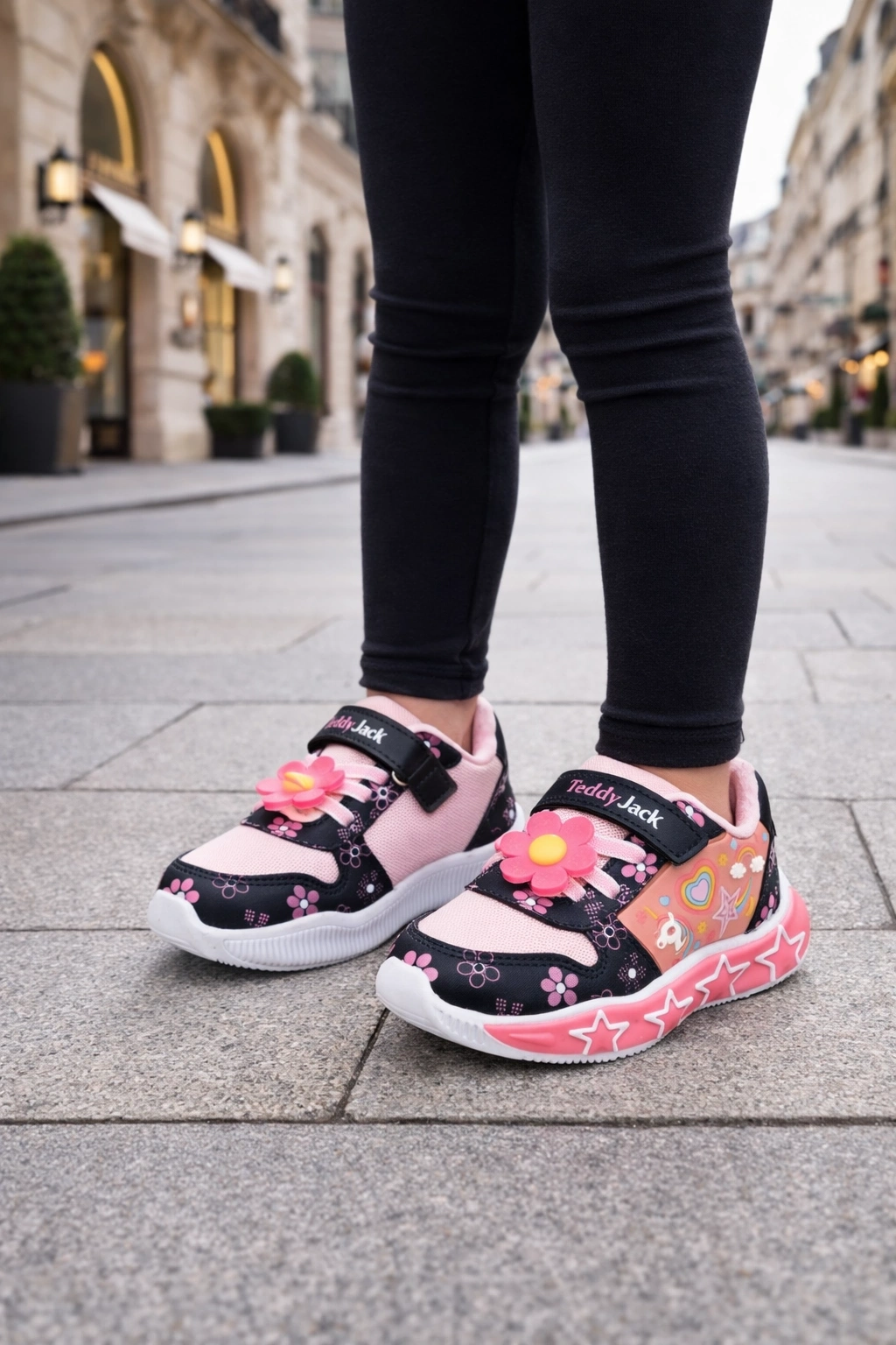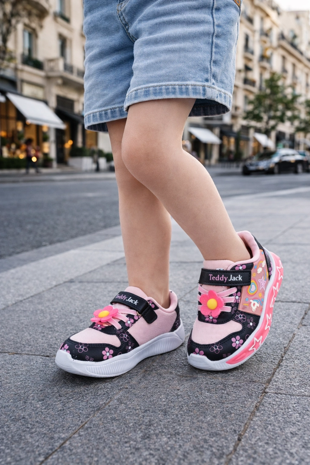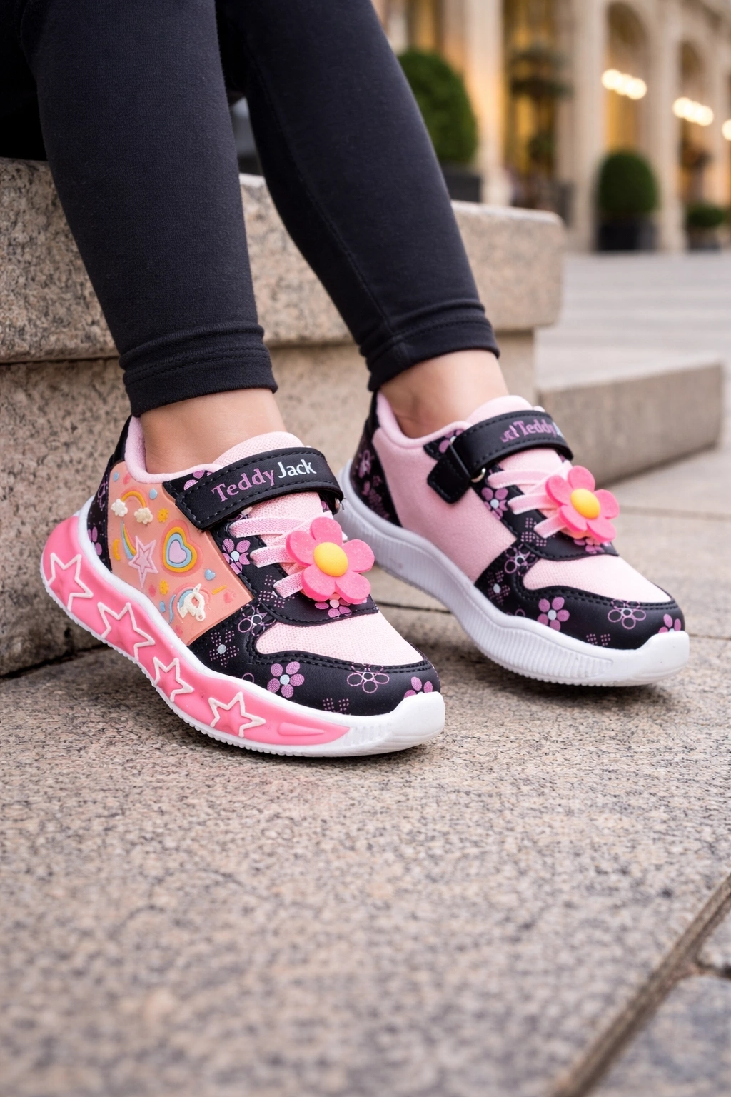 Kız çocuklar için tasarlanan bu eğlenceli ve şık spor ayakkabı, renkli desenleri ve sevimli figür detaylarıyla dikkat çeker.