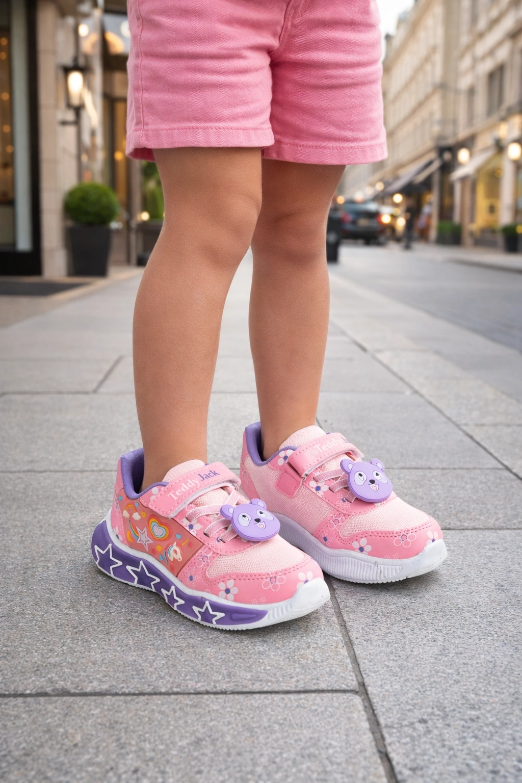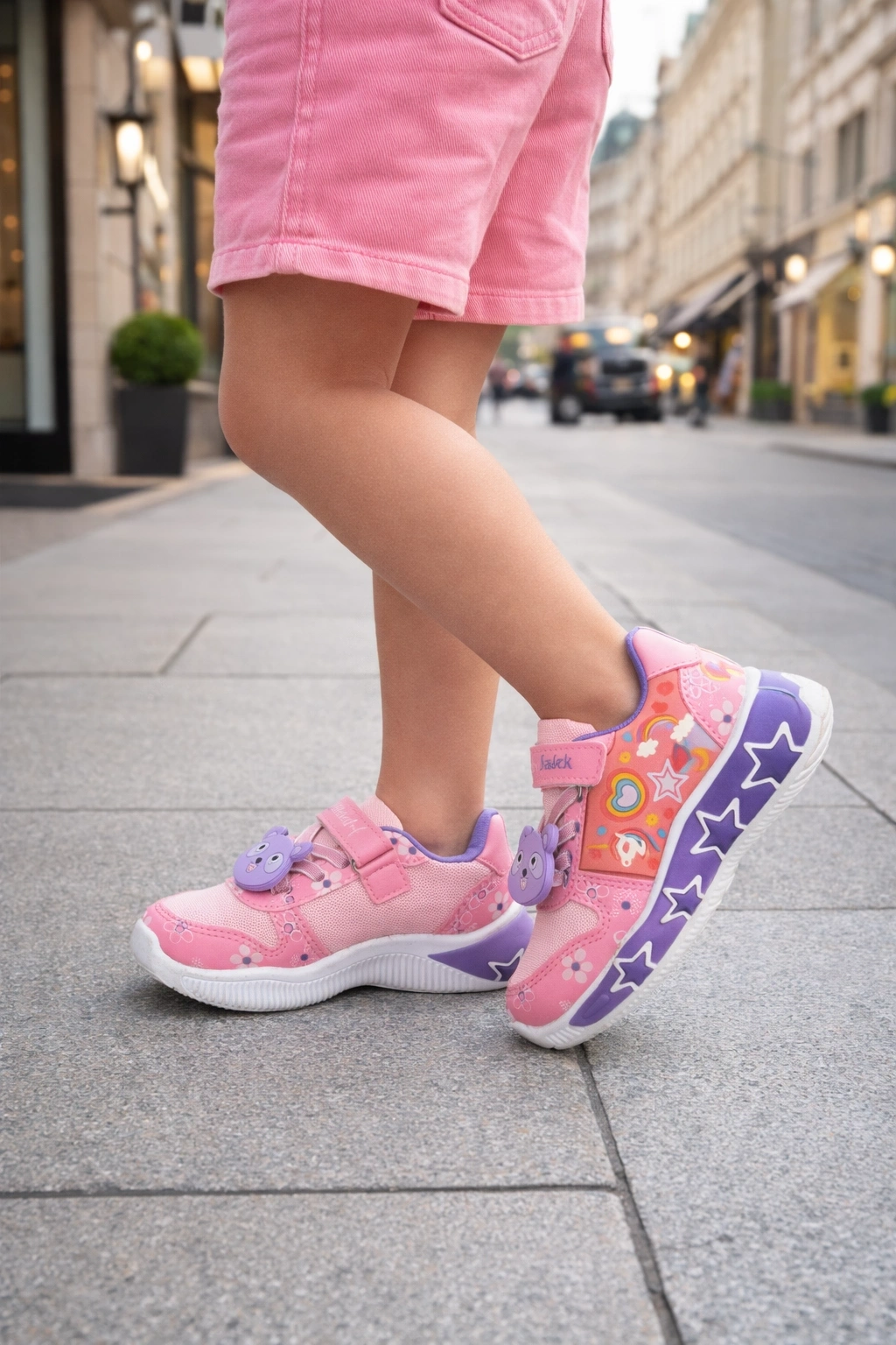 Kız çocuklar için tasarlanan bu eğlenceli ve şık spor ayakkabı, renkli desenleri ve sevimli figür detaylarıyla dikkat çeker.