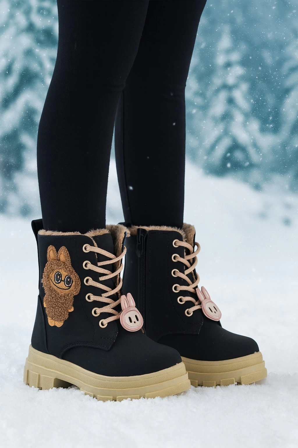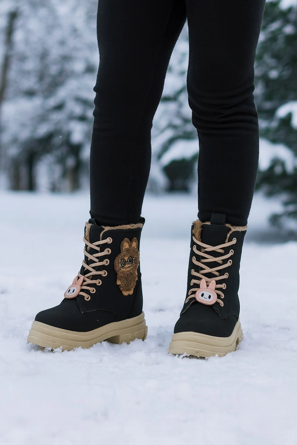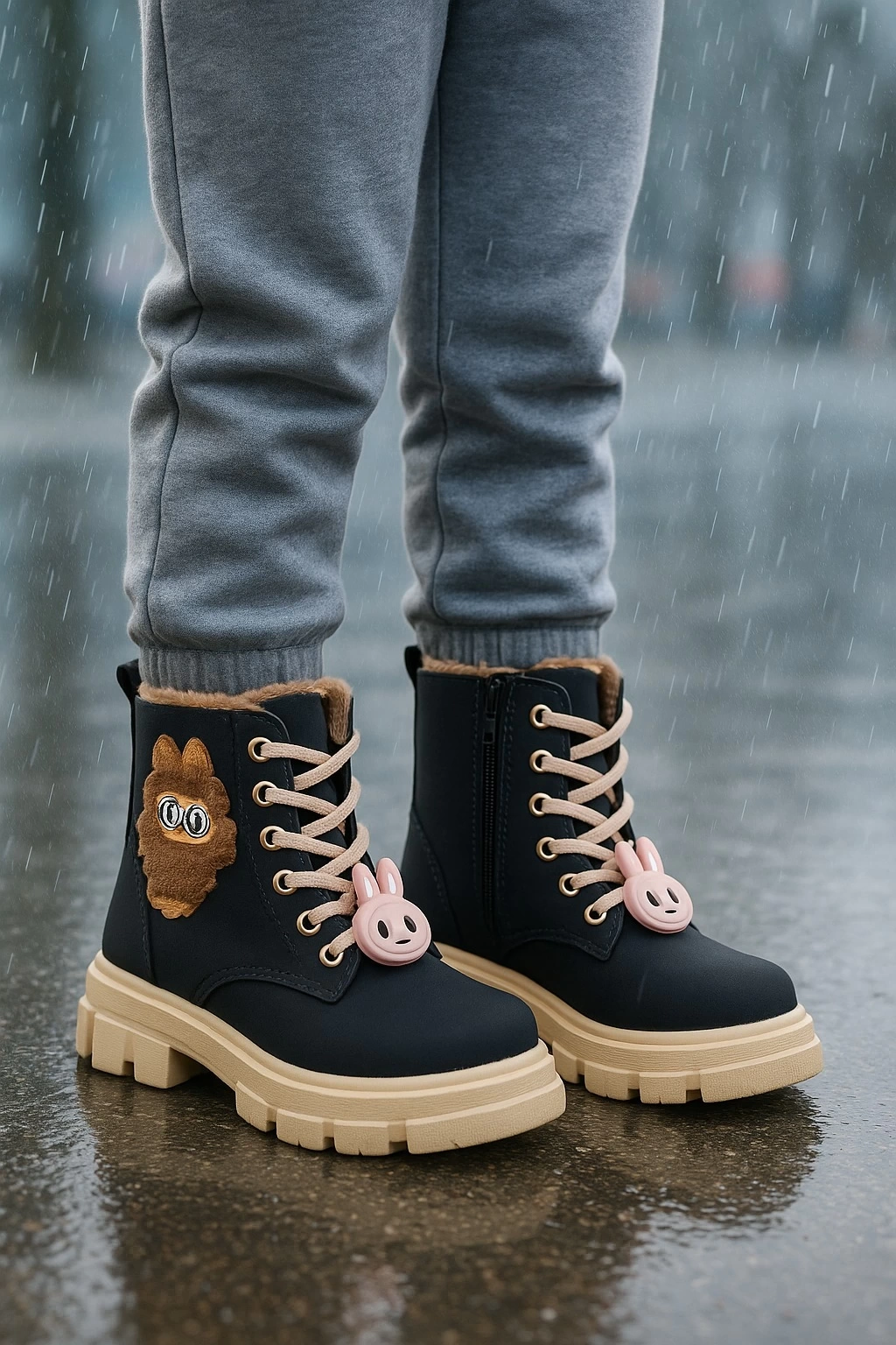 Kız Çoçuk Sim Detaylı Kışlık Kaymaz Taban Su Geçirmez Cırt Cırtlı Yarım Bot