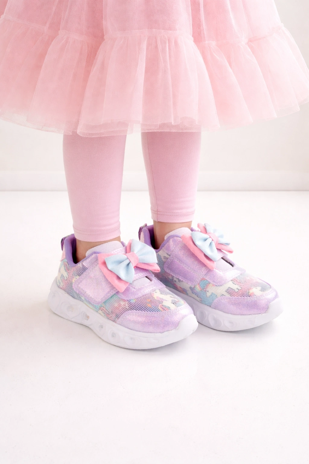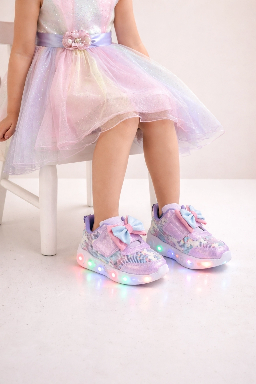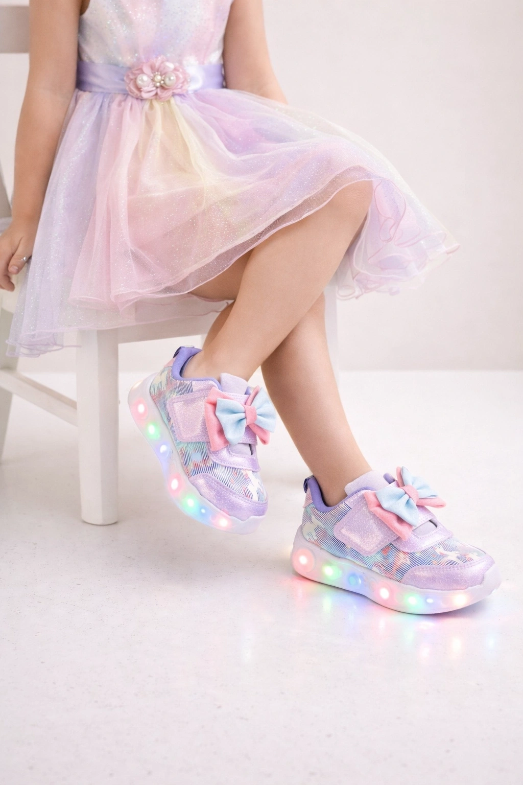 Kız Çocuk Kurdele Detay Simli LED Taban Spor Ayakkabı