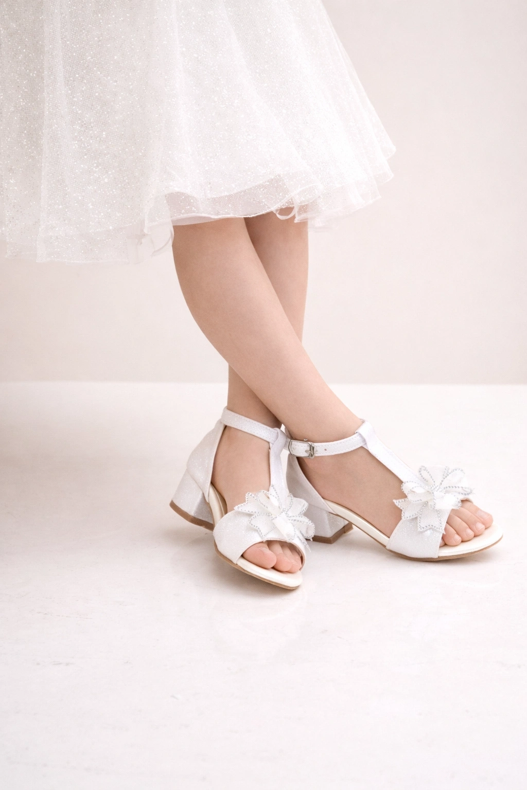 Kız çocuklar için tasarlanan bu gümüş simli abiye sandalet, şık fiyonk detayı ve bilekten tokalı yapısıyla özel gün kombinlerini tamamlar.