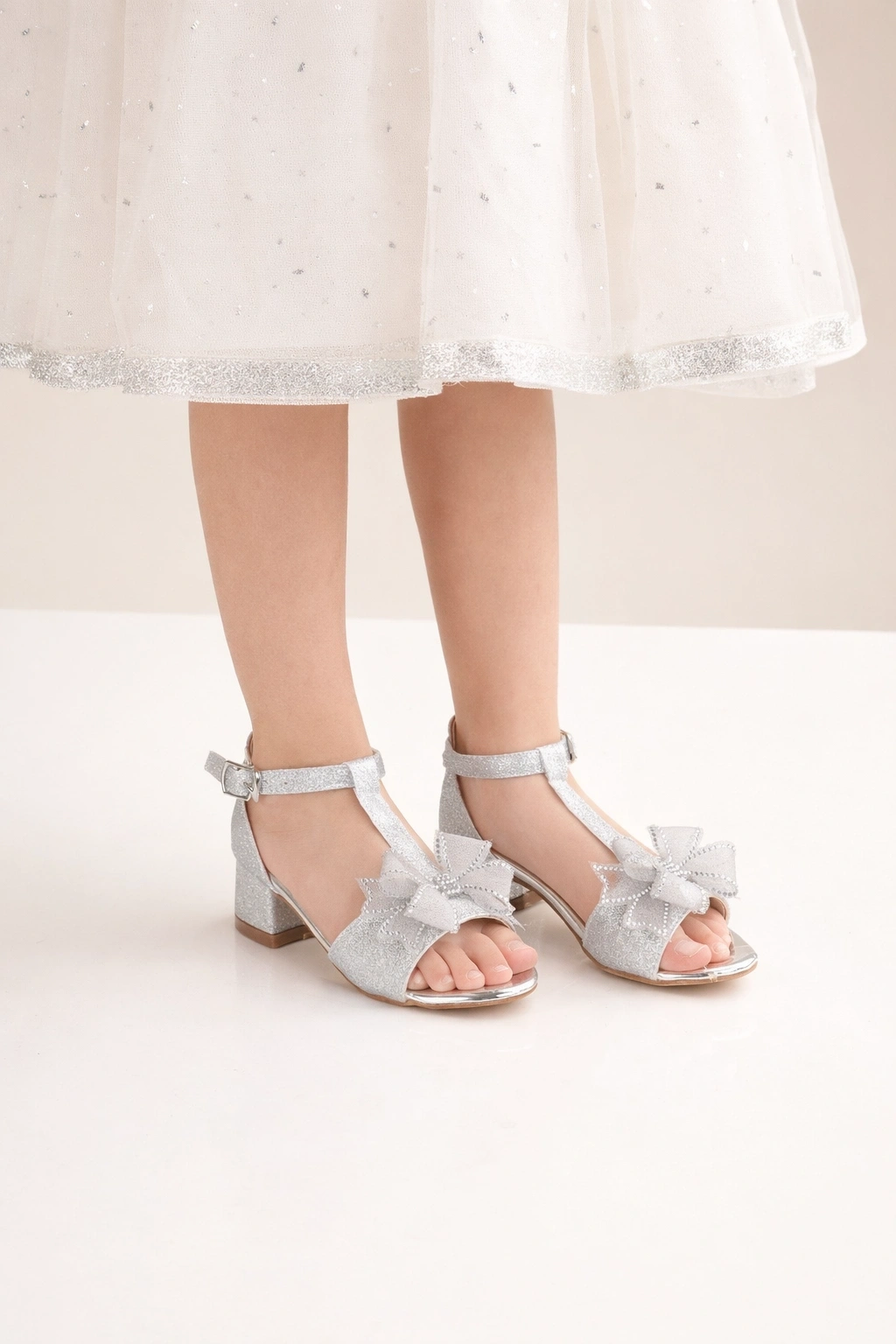 Kız çocuklar için tasarlanan bu gümüş simli abiye sandalet, şık fiyonk detayı ve bilekten tokalı yapısıyla özel gün kombinlerini tamamlar.