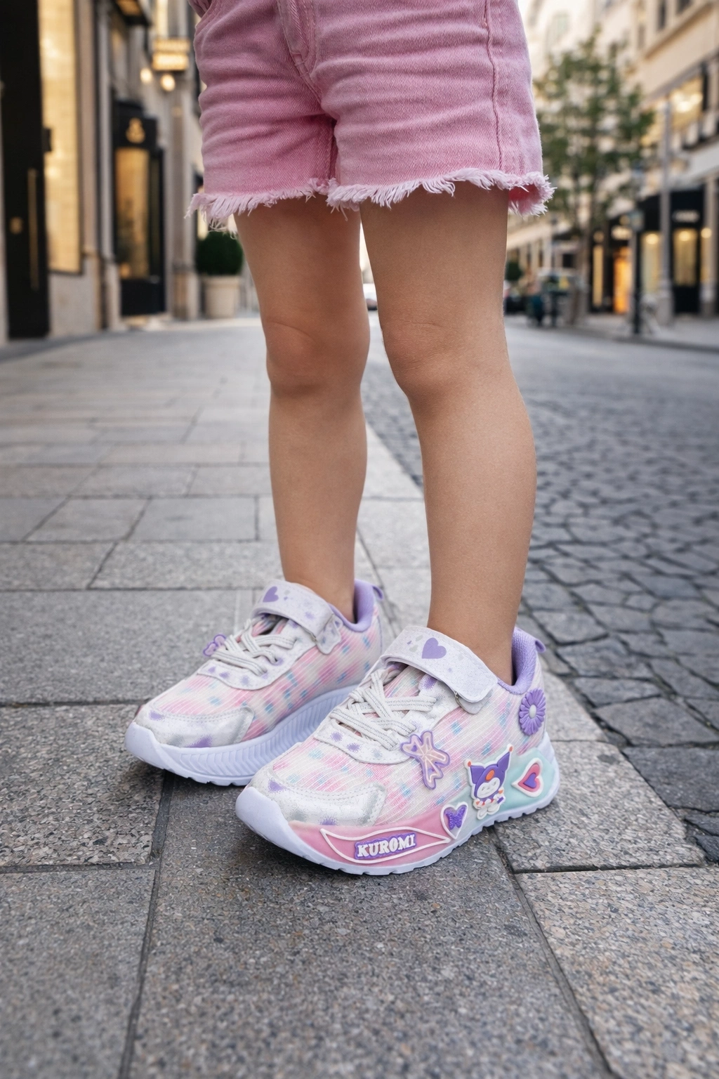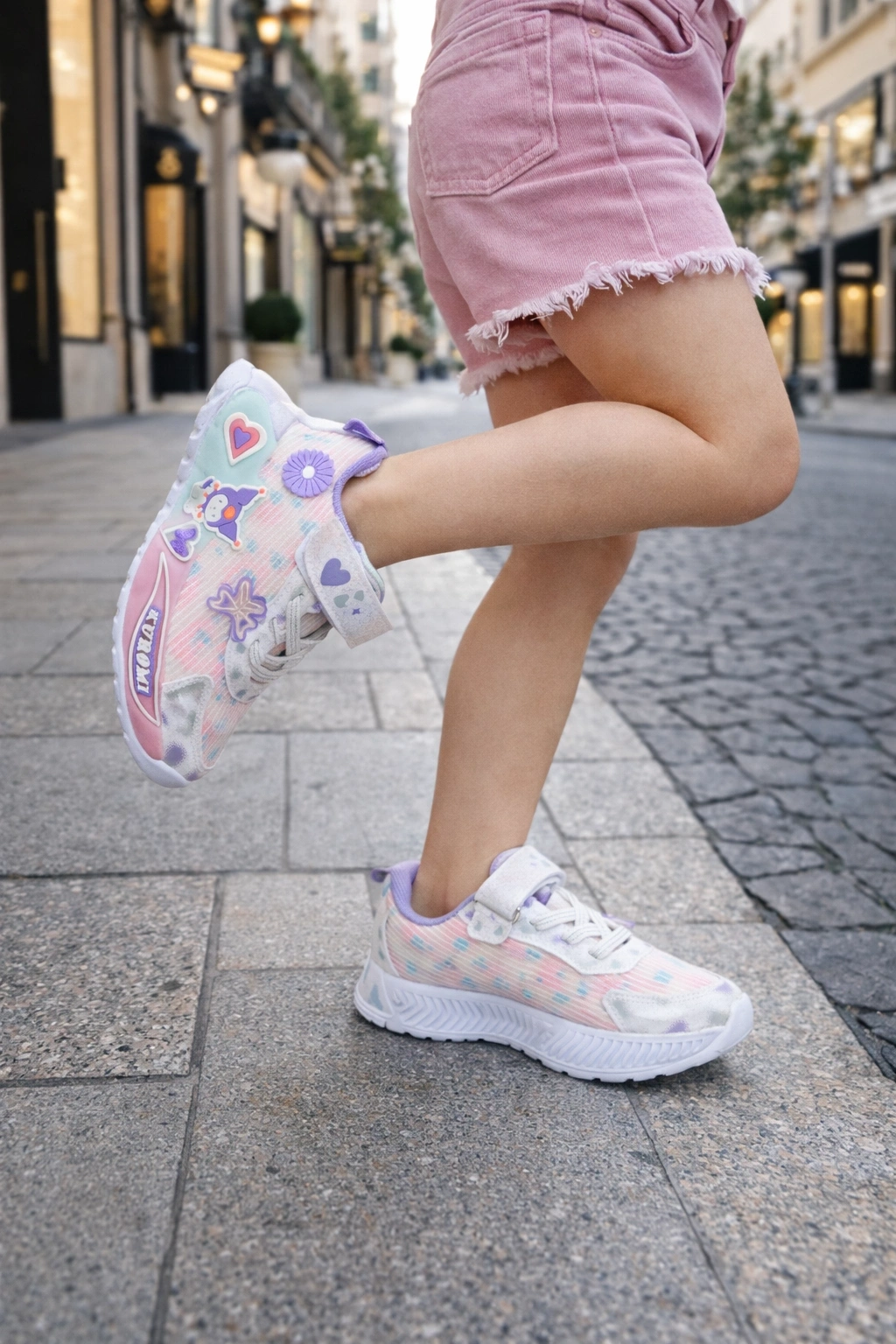 Kız çocuklar için tasarlanan bu şık spor ayakkabı, modern görünümü ve eğlenceli detaylarıyla dikkat çeker.