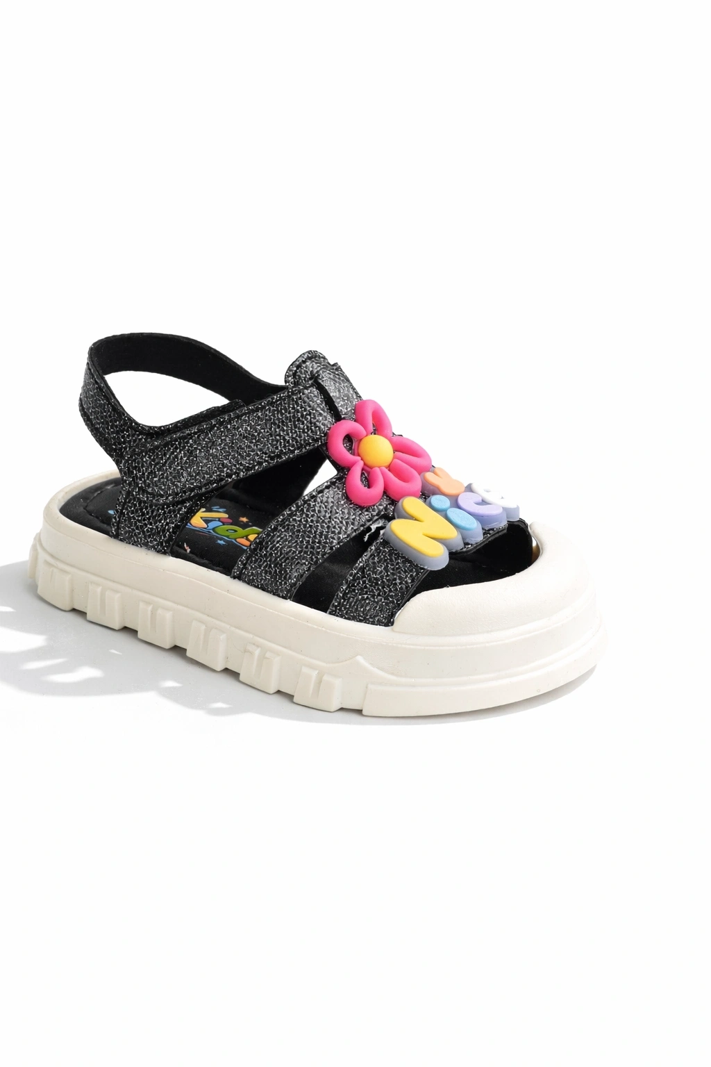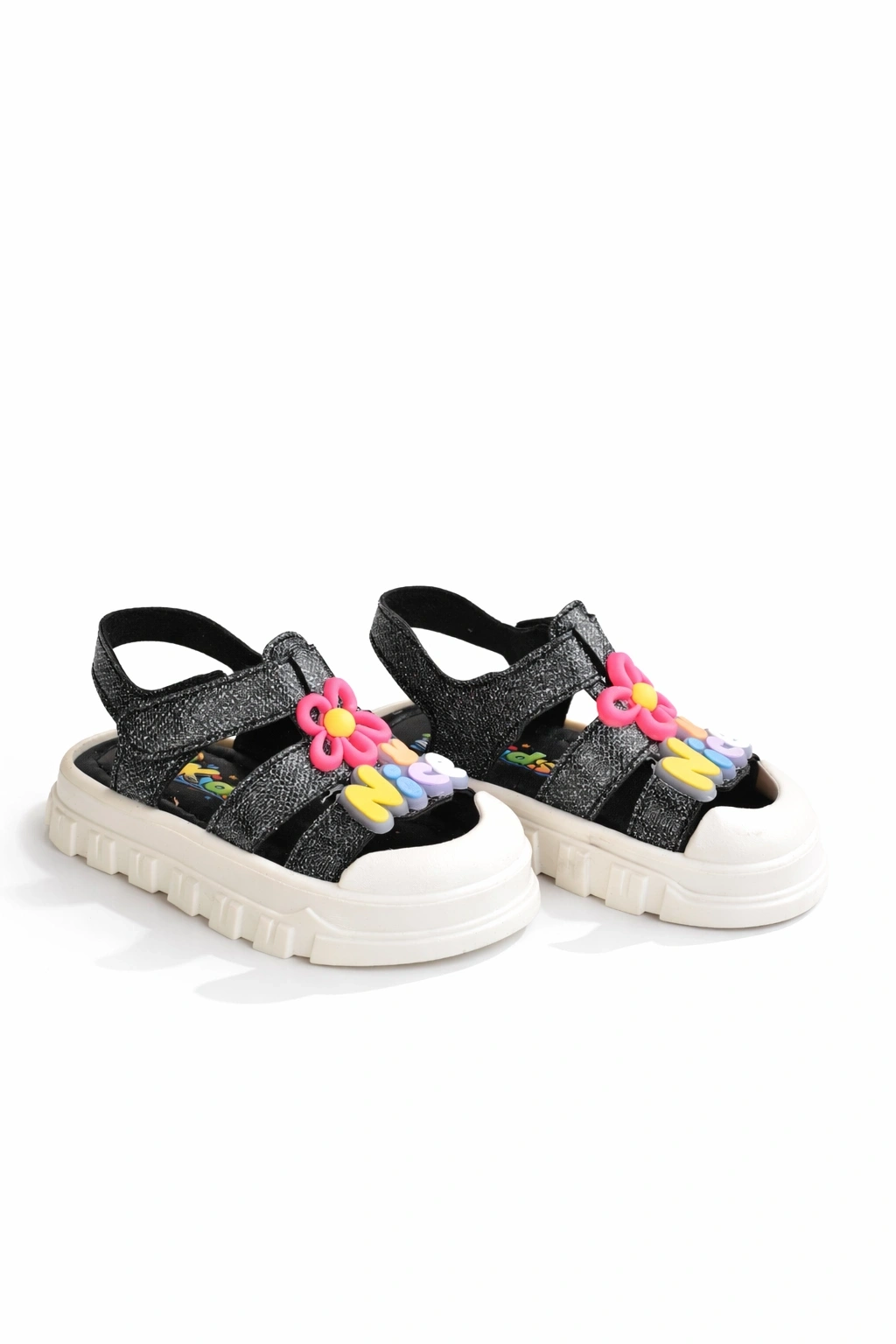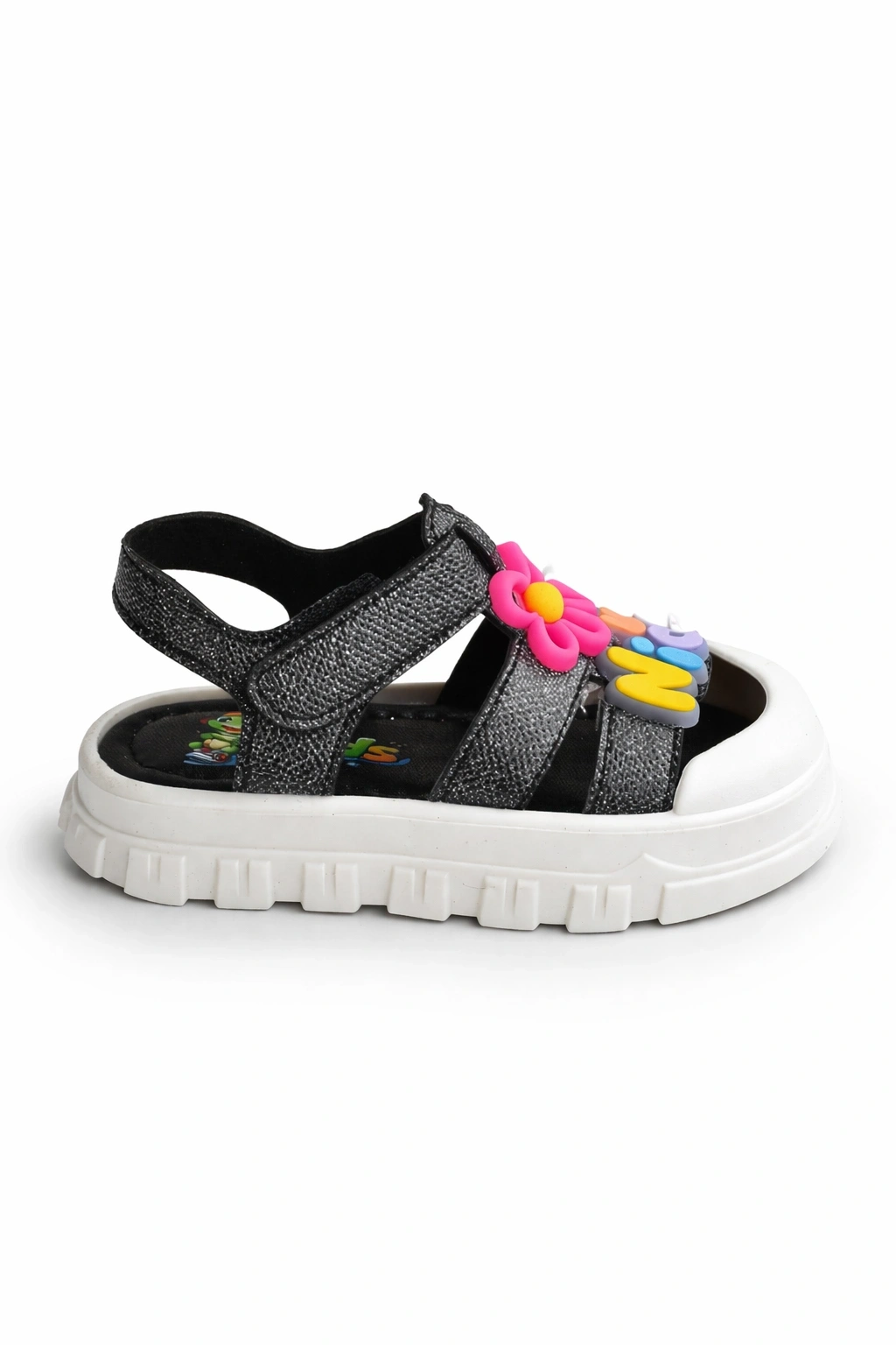 Canlı renK ve sevimli çiçek detaylarıyla öne çıkan bu kız çocuk sandalet, yaz aylarında hem şıklık hem de konfor sunar.