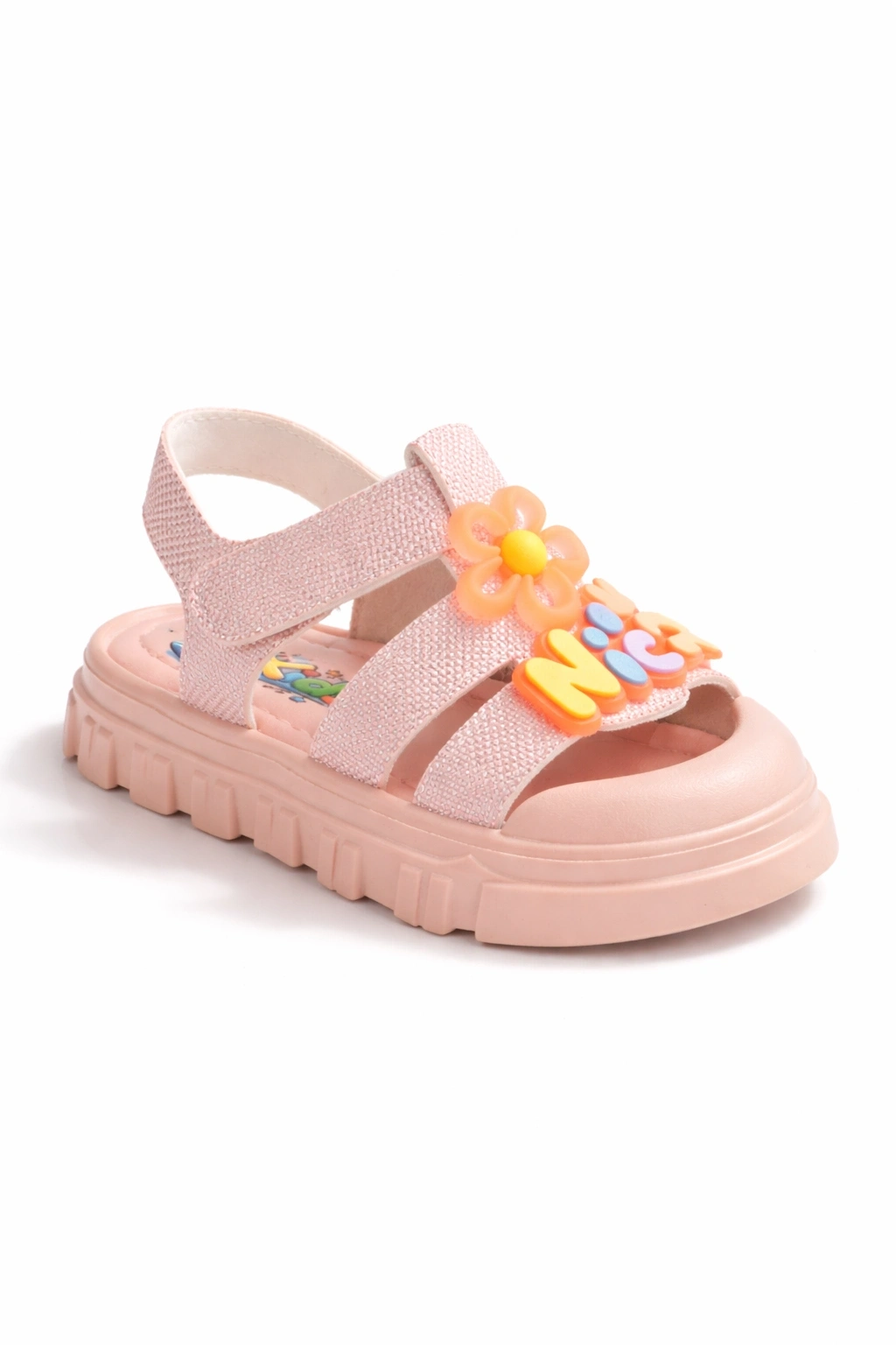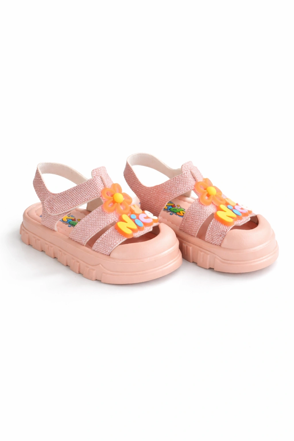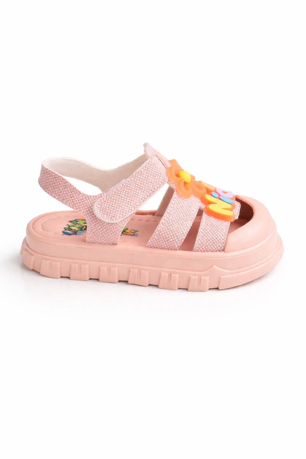 Canlı renK ve sevimli çiçek detaylarıyla öne çıkan bu kız çocuk sandalet, yaz aylarında hem şıklık hem de konfor sunar.