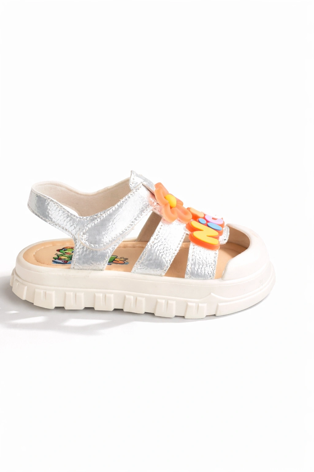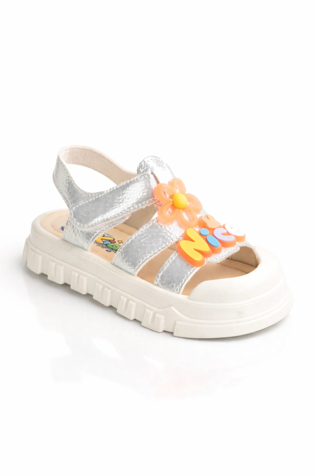 Canlı renK ve sevimli çiçek detaylarıyla öne çıkan bu kız çocuk sandalet, yaz aylarında hem şıklık hem de konfor sunar.