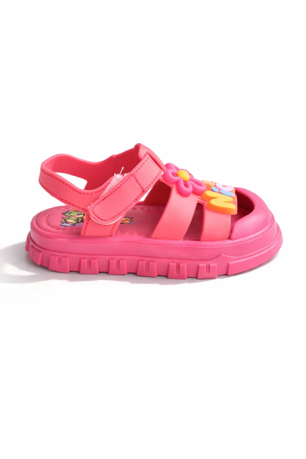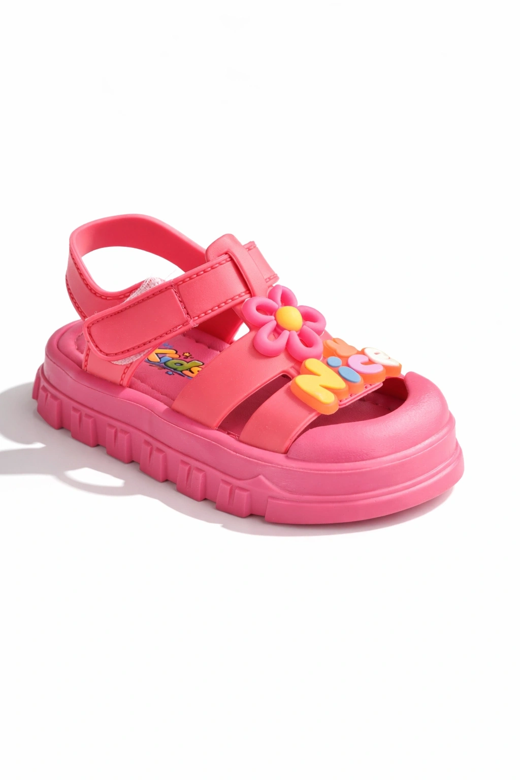 Canlı renK ve sevimli çiçek detaylarıyla öne çıkan bu kız çocuk sandalet, yaz aylarında hem şıklık hem de konfor sunar.
