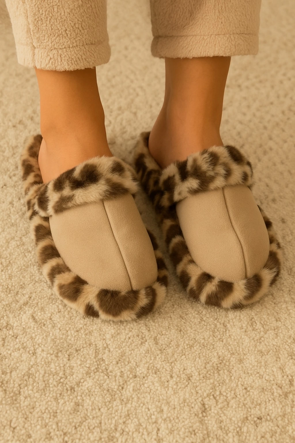 Leopar deseniyle şıklığı evinize taşıyan bu terlik, kış aylarında ayaklarınızı sıcacık tutarken stilinizi de ön plana çıkarır.