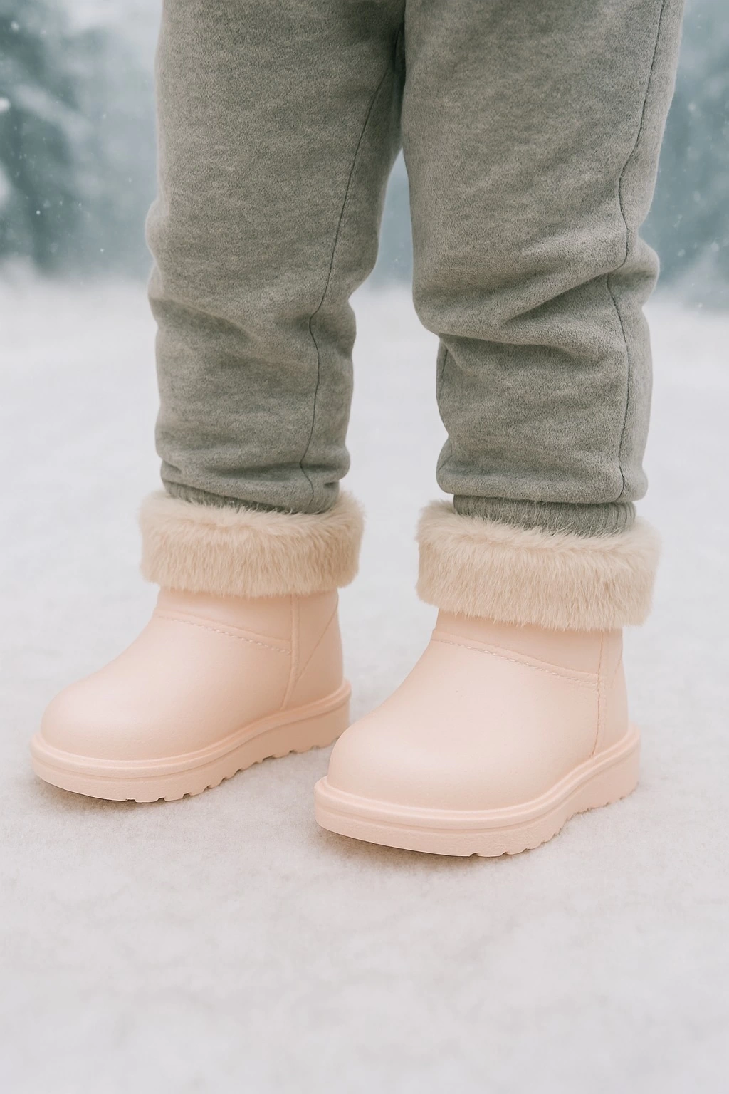 Kış aylarında çocukların ayaklarını sıcak tutan kürk detaylı tasarım.