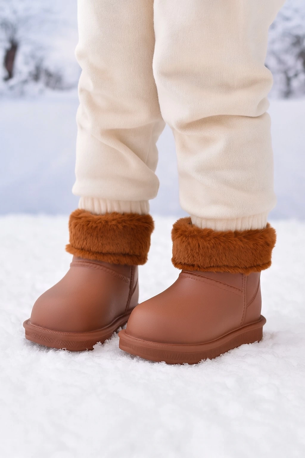 Kış aylarında çocukların ayaklarını sıcak tutan kürk detaylı tasarım.